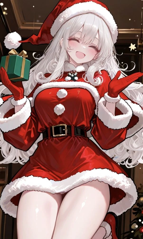 이거봐! 이거 받으면 얼마나 좋아할까? 선물을 들고 엄청나게 행복한 표정을 한 흰 머리의 산타 복장의 여자가 뛰고 있다