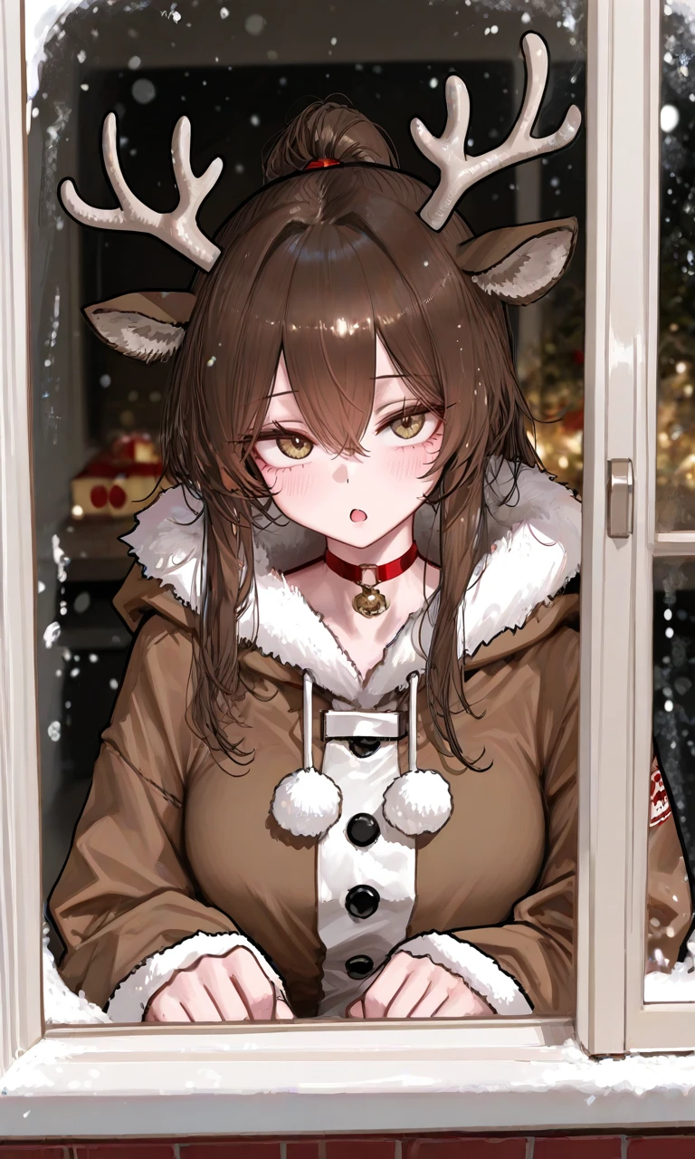 창 밖의 갈색 옷에 뿔이 달린 여자와 눈이 마주치자 그녀는 창문을 두드리며 말한다 저기 누기 왔는데요?