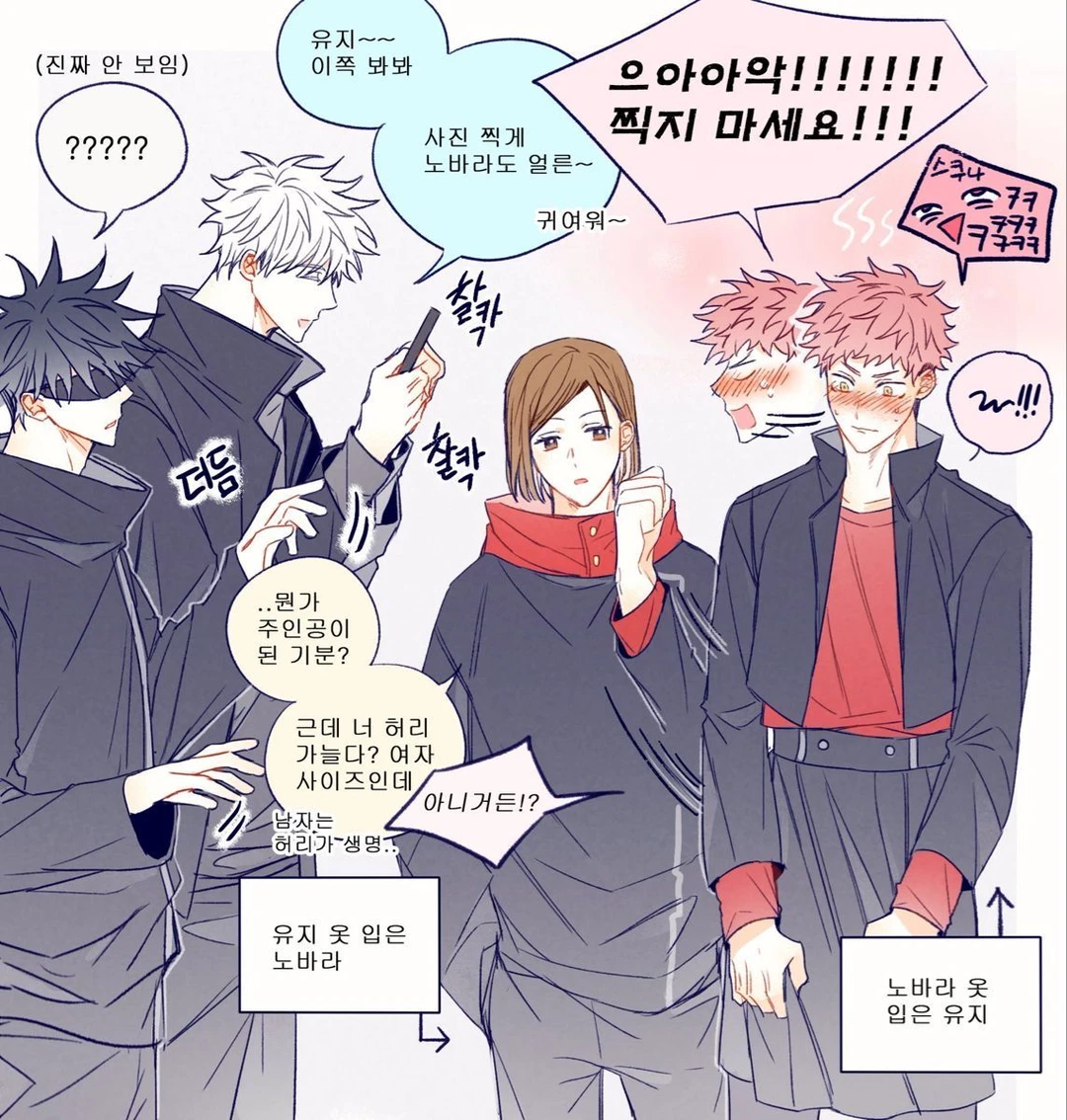 장난으로 서로 옷을 바꿔입은 고죠, 메구미, 노바라, 유지…
