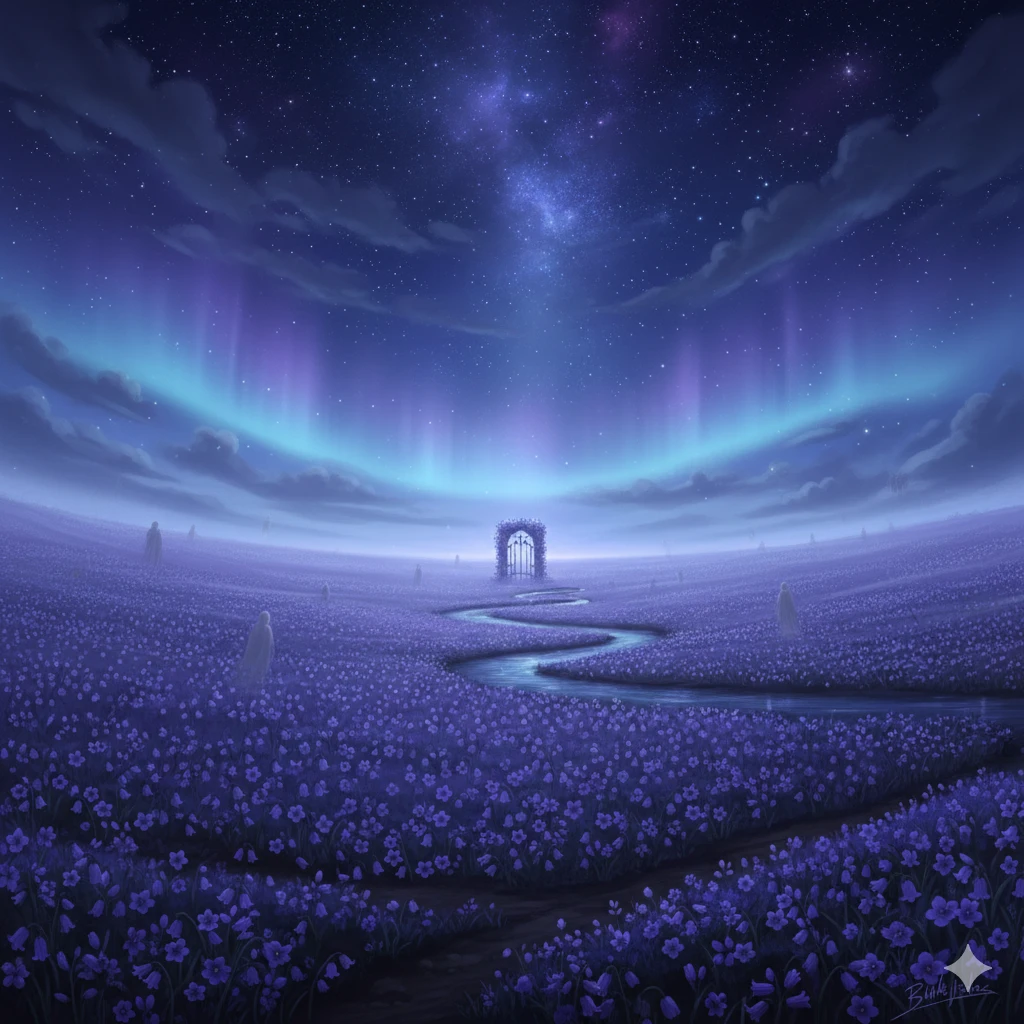 저승의 대지는 끝을 알 수 없는 연보랏빛 블루벨 꽃밭으로 덮여 있다. 영혼들이 이곳에 발을 들이는 순간, 지상에서의 고통스러운 기억은 꽃향기에 녹아내리고 오직 평온함만이 남게 된다. 밤하늘을 수놓은 은하수와 신비로운 보랏빛 오로라는 이곳이 신성한 영역임을 증명하며, 영혼들이 길을 잃지 않도록 부드러운 빛을 내려준다.