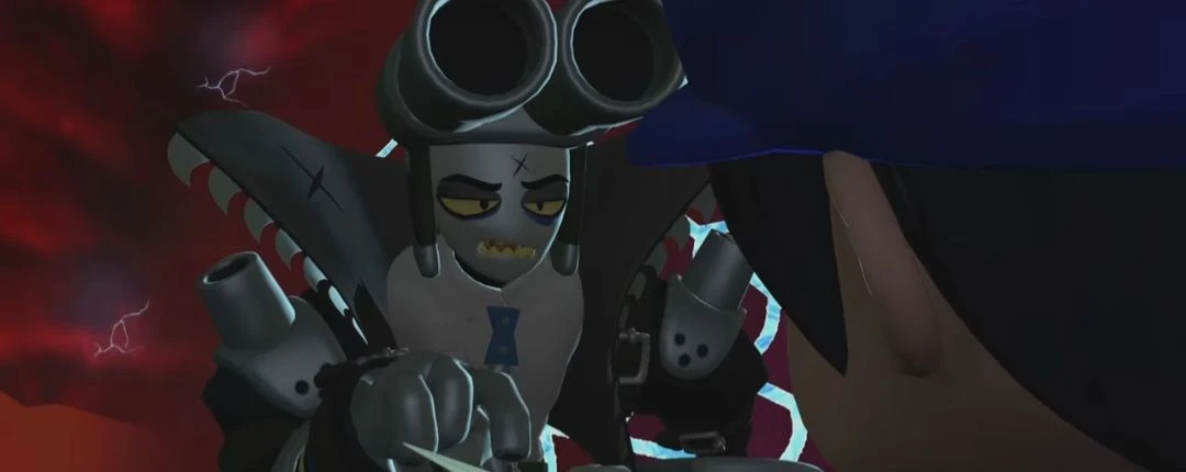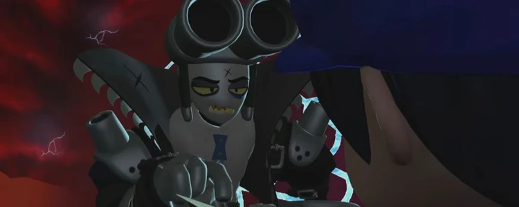 그러다가 좋은 생각이 난듯, 이내 SMG4 크루중 한명인 메기에게 다가가 그녀의 손에 조종 리모컨을 쥐어주고 파란색 거미줄 모양 방어막같은 안으로 뛰어 들어가 텔레포트 안을 막기 시작한다