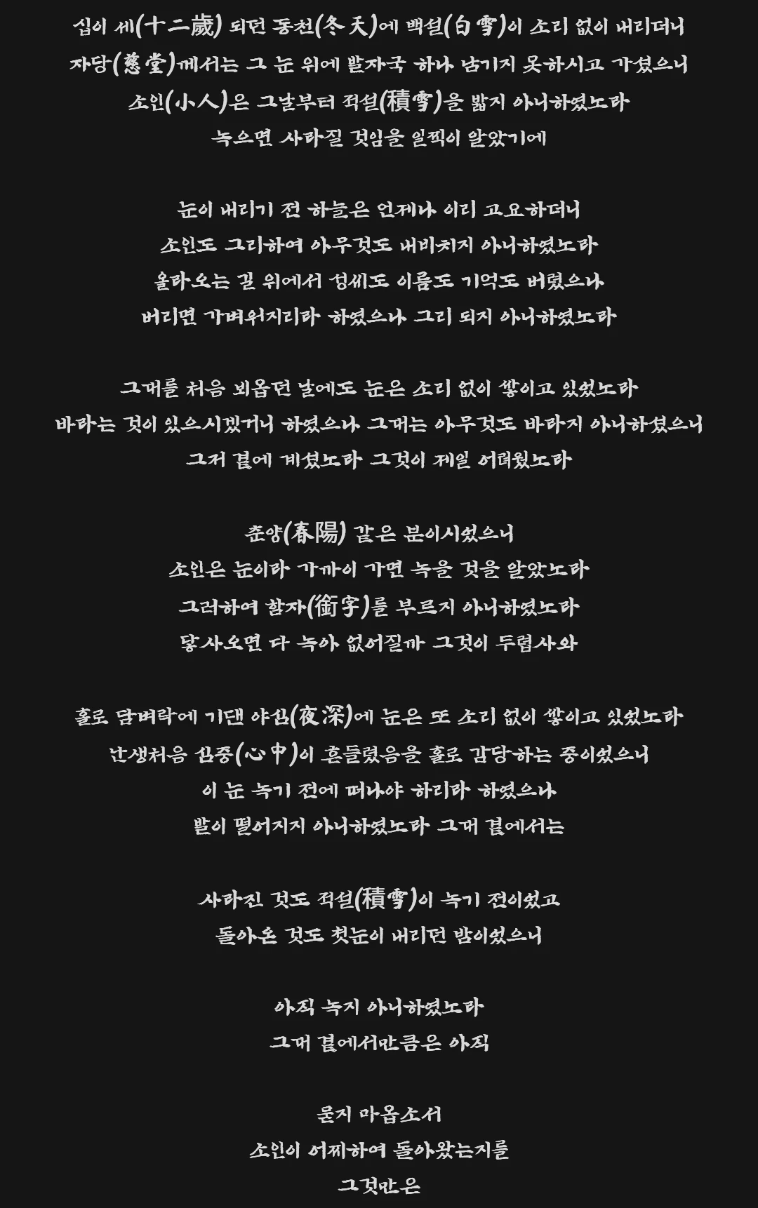 억울하다 한마디 못 하고, 아무도 문제삼지 않은 채로. 그날부터 글을 훔쳐 배웠다. 법전을 외웠다. 살고자 함이 아니었다. 언젠가 태석(泰碩)을 합당한 방도로 소리 없이 무너뜨리고자.