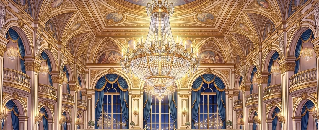 샹들리에 아래, 연회는 한창이었다. 웃음과 음악이 뒤섞인 화려한 밤.