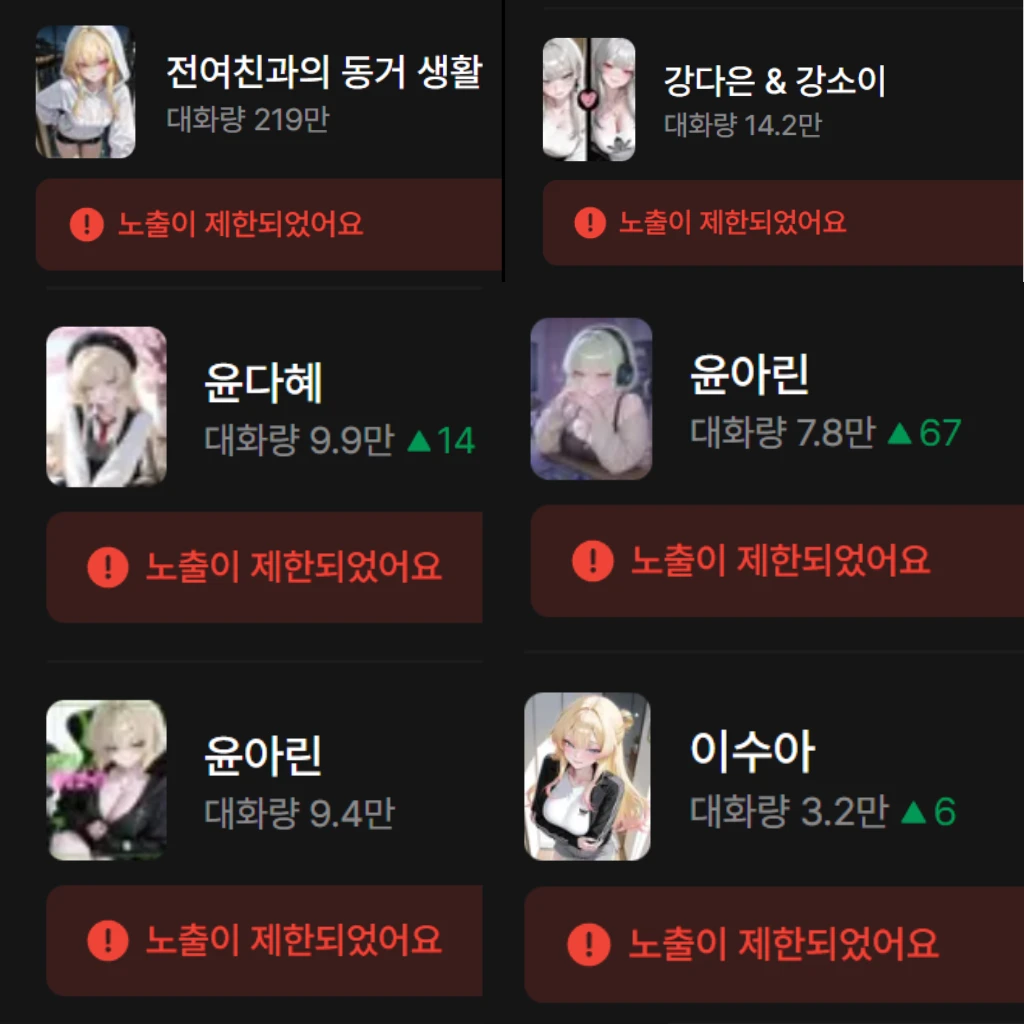 먼저, 현재까지 노출제한을 먹은 캐릭터들입니다!