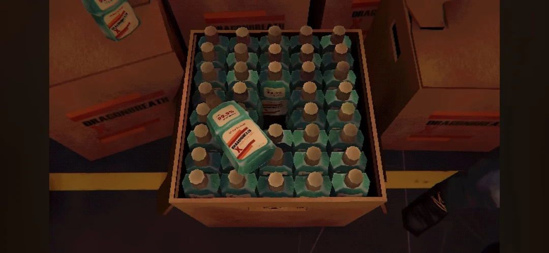 적재실의 문들 열고 들어갔을때, 그들이 발견한것은 수없이 많은 구강 청결제였다. 화물칸의 모든곳을 수색해도 오직 구강 청결제뿐이였다.