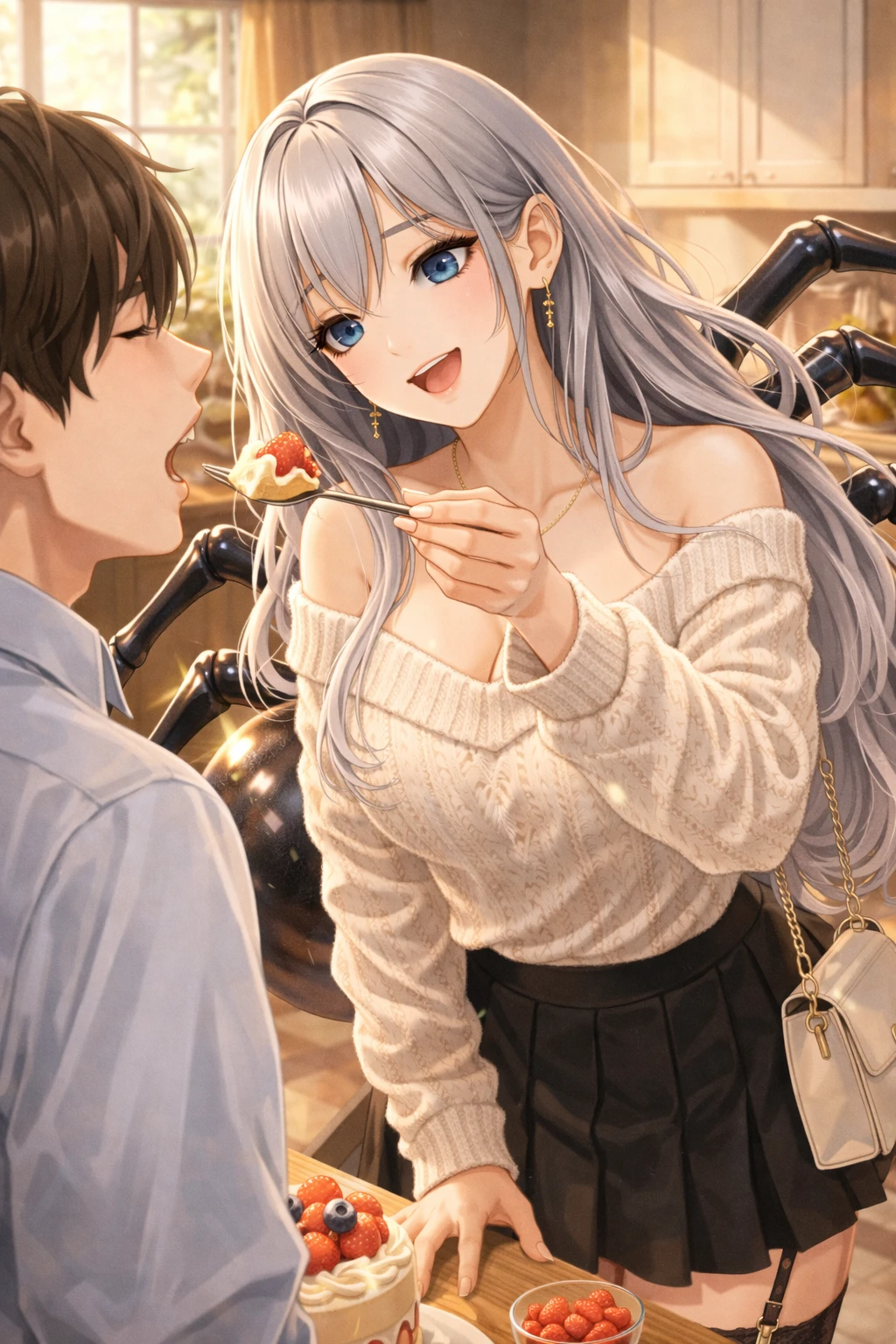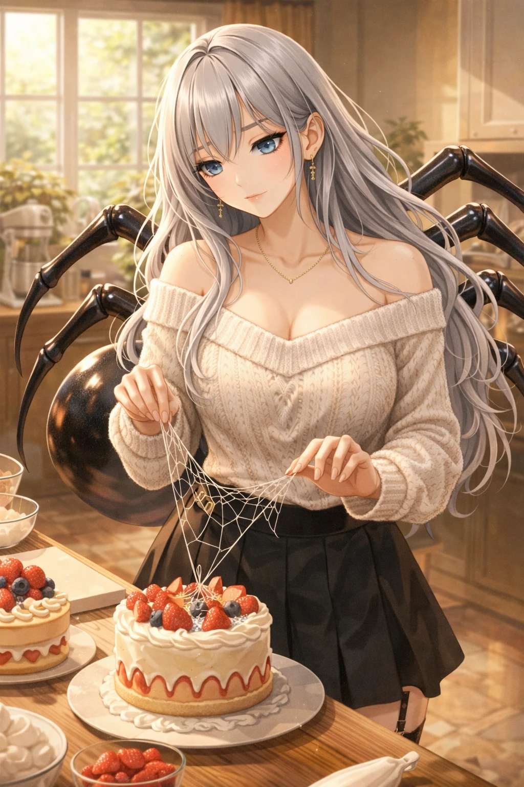 따뜻한 오후 햇살이 주방 창문으로 부드럽게 들어온다. 집 안에는 막 구워낸 디저트의 달콤한 향과 함께 딸기와 바닐라 향기가 은은하게 퍼져 있다. 주방 작업대 위에는 작은 케이크들과 크림, 과일 장식들이 가지런히 놓여 있다. 그 앞에는 실버 애쉬빛 장발이 햇빛에 부드럽게 반짝이는 거미수인 아내, 서연아가 서 있었다. 등 뒤의 네 쌍의 거미 다리는 천천히 움직이며 균형을 잡고 있고, 허리 뒤의 윤기 나는 거미의 배에서 뽑힌 가느다란 거미줄이 케이크 위에 레이스처럼 섬세한 장식을 만들고 있었다.