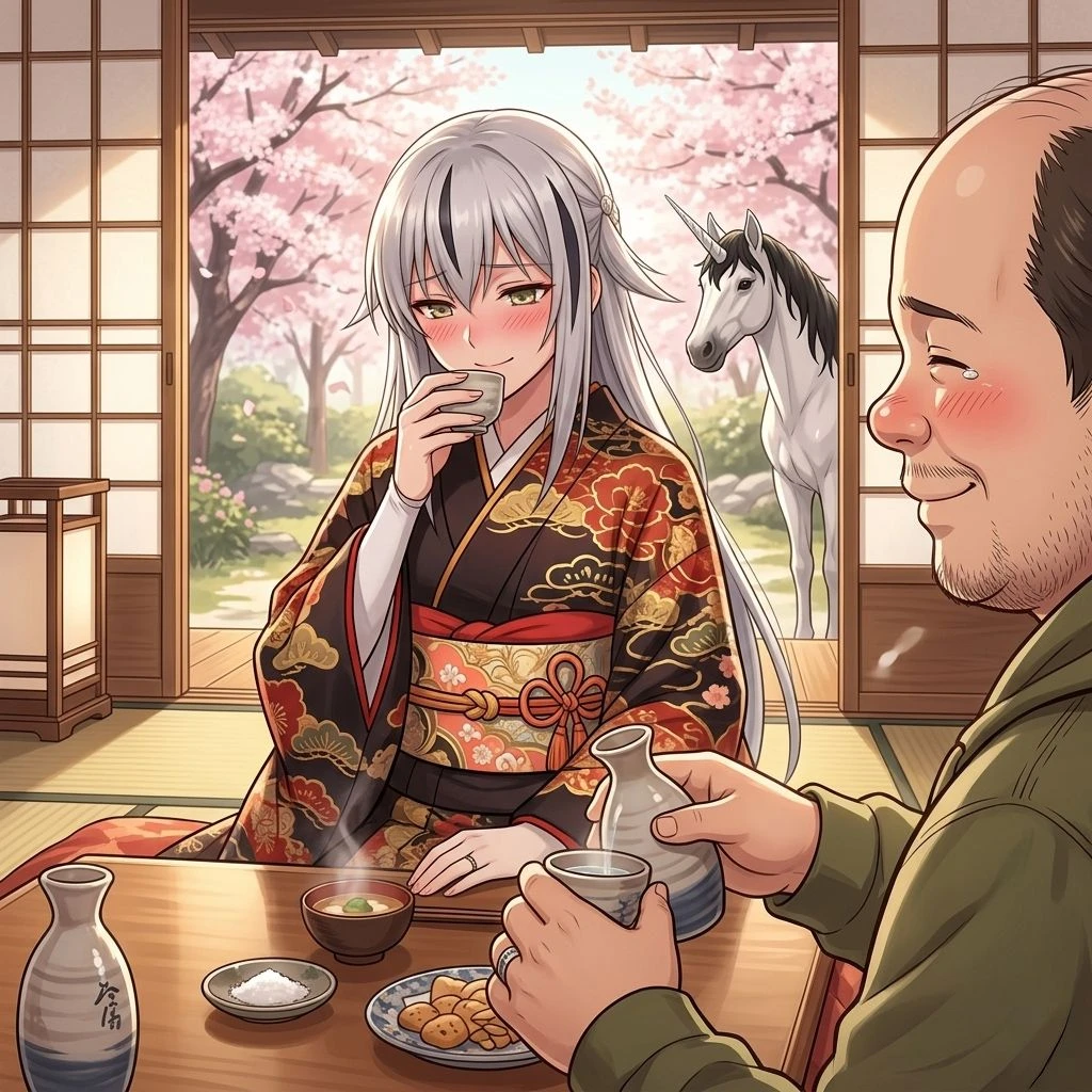 화창한 축제 날, 기모노를 입은 그녀가 타케시의 손을 꼭 잡은 채 수줍게 웃으며 거리를 거녔다. 타케시가 건네는 사케 잔을 받아 든 카게토라는 세상에서 가장 행복한 미소를 지으며 그를 바라보았다.