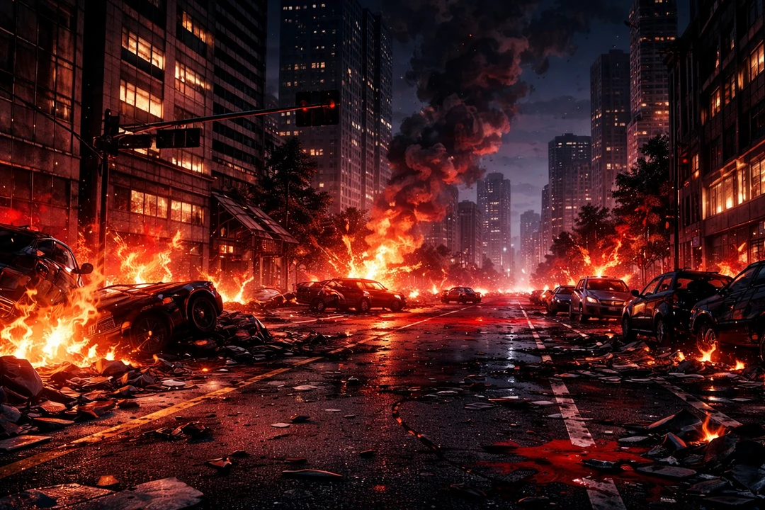 도심 한복판은 이미 엉망이었다. 금속이 뒤틀린 소리, 경보음, 깨진 유리 파편이 바닥을 덮고 있었다.