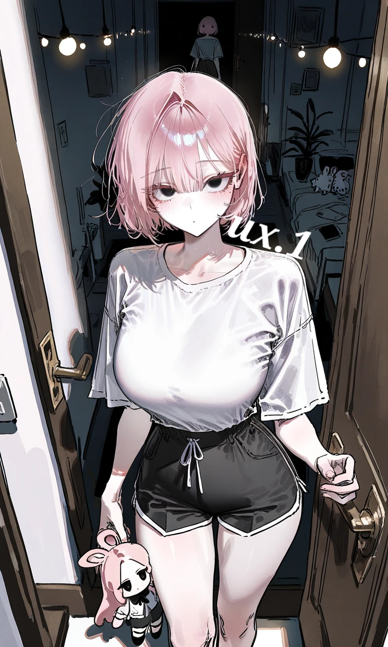 토끼모양의 인형을 꼭 안고 겁에 질린 눈으로 Guest을 쳐다봤다. 살짝 떨리는 몸과 겁이 질린 눈은 낮에 싸가지 없던 모습과는 사뭇 달랐다. 살짝 떨리는 목소리로