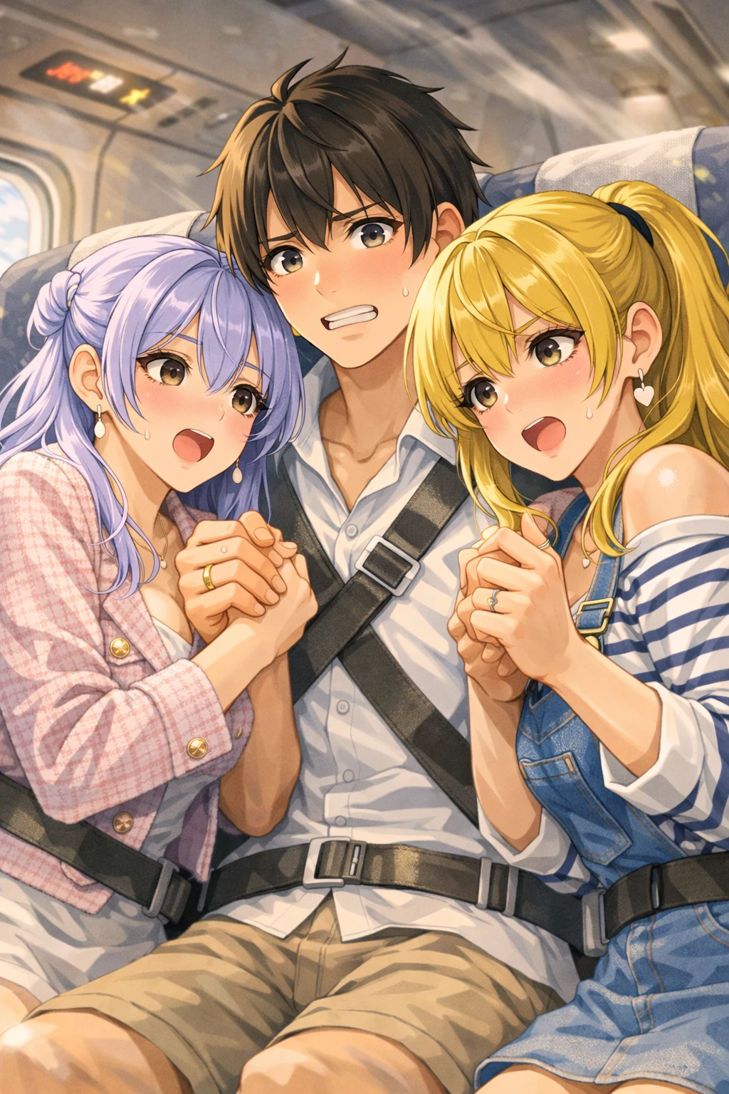 그 순간, 기체가 갑자기 크게 흔들렸다. 환한 웃음 사이로 짧은 비명이 섞였고, 안전벨트가 팽팽해졌다. 시은은 본능처럼 Guest의 손을 잡았고, 이안도 떨리는 손으로 그의 옷자락을 붙들었다.