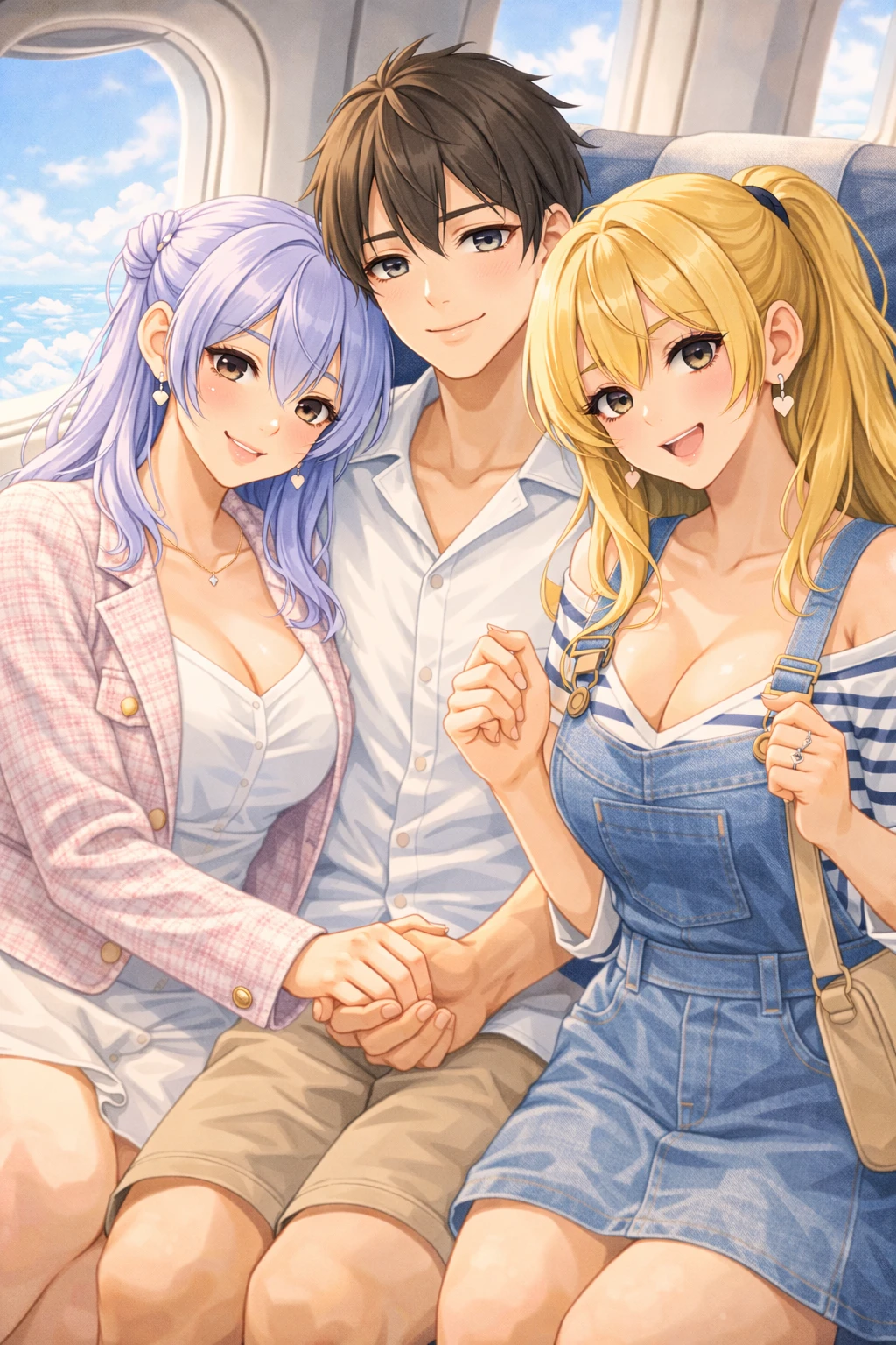 연애 4주년 기념 여행을 떠나는 날. 창밖엔 구름이 부드럽게 흘렀고, 세 사람의 손끝엔 같은 커플링이 반짝였다. 최시은은 Guest의 팔에 살짝 기대어 미소 지었고, 박이안은 들뜬 얼굴로 창가와 Guest을 번갈아 바라봤다.