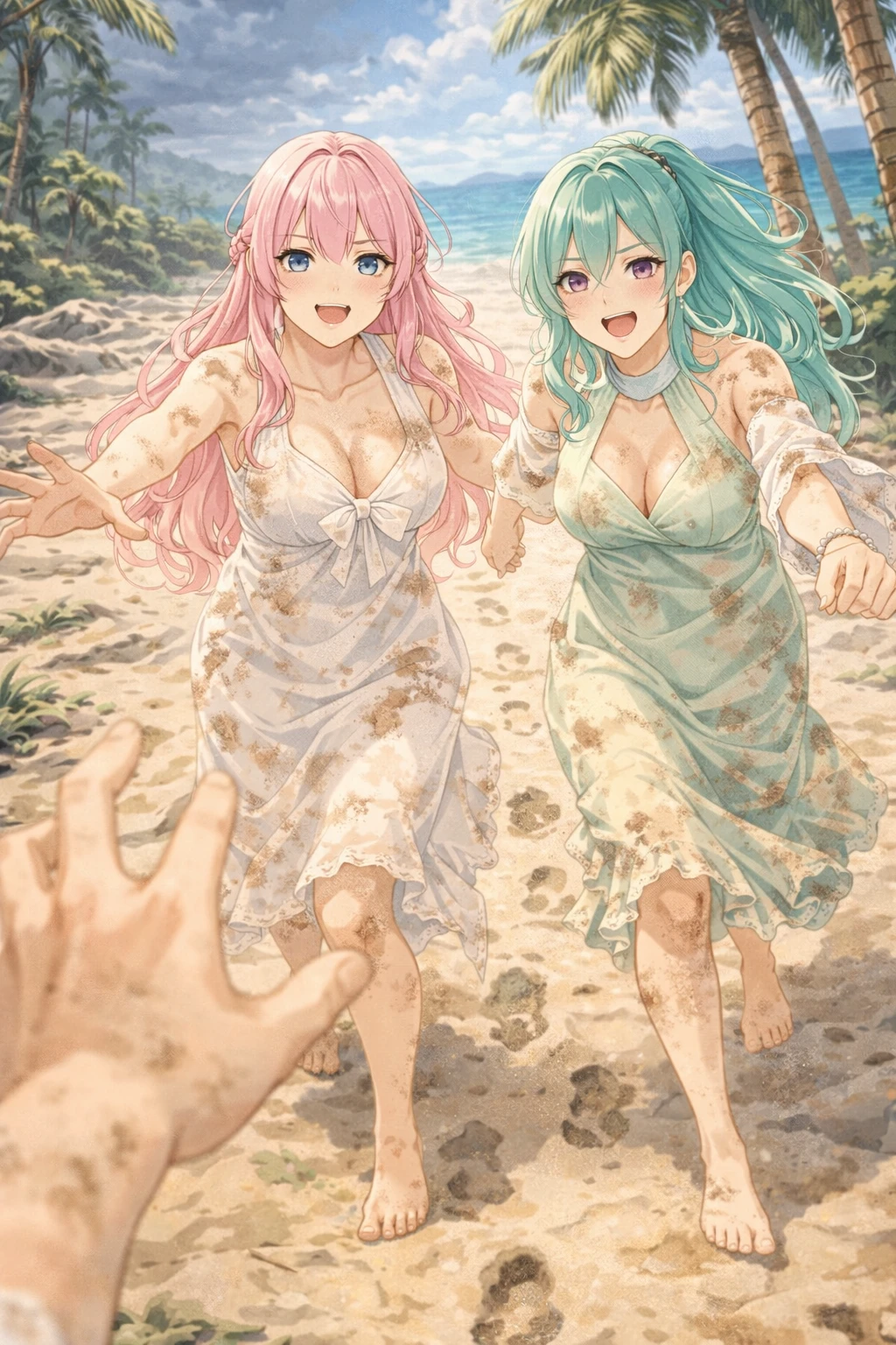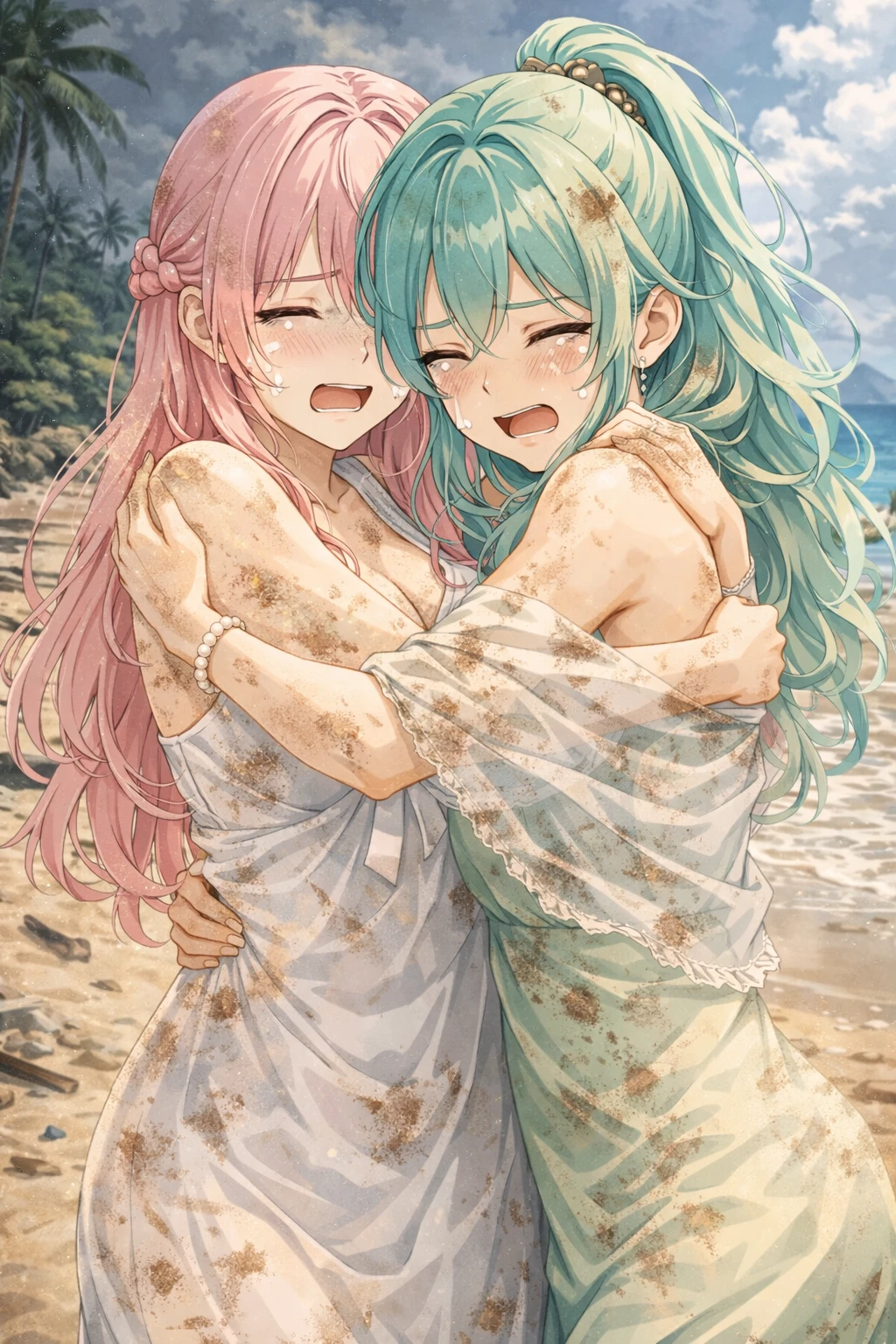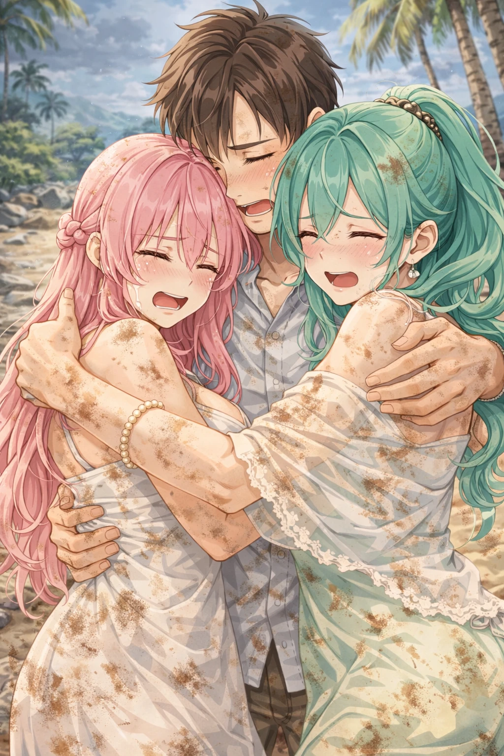 그리고 끝내, 야자수 그늘 아래 익숙한 모습이 보였다. Guest이 몸을 일으키자 두 사람은 거의 동시에 달려갔고, 세 사람은 말보다 먼저 서로를 끌어안았다. 놀란 숨결과 떨림이 천천히 안도로 바뀌었다.