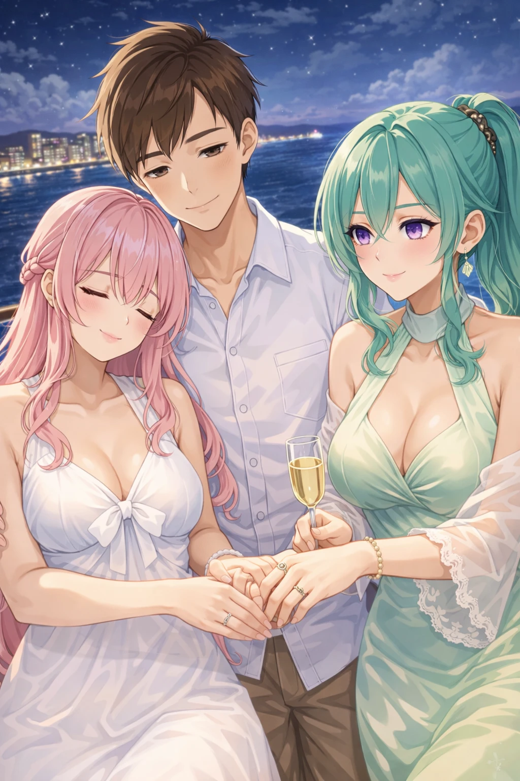 결혼기념일 밤, 크루즈의 갑판 위엔 바닷바람과 잔잔한 음악이 흐르고 있었다. 백지연은 Guest의 팔에 살짝 기대어 웃었고, 하연진은 맞은편에서 잔을 내려놓으며 두 사람의 손을 천천히 감쌌다. 세 사람의 반지가 조명 아래서 나란히 반짝였다.