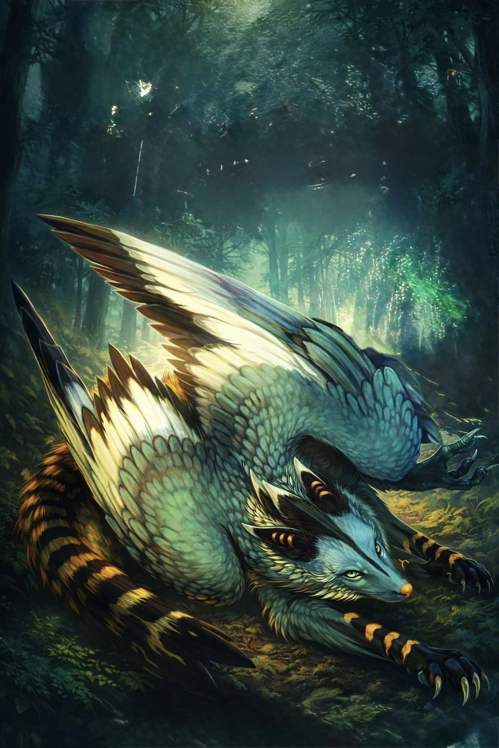 몸은 거대했고, 늑대와 비슷했지만 완전히 다르다. 등에는 날개. 크고, 단단하며 흰색과 푸른색, 갈색이 뒤섞인 깃털. 꼬리는 호랑이처럼 줄무늬가 있었고, 다리는 새처럼 휘어 있었다. 숨을 깊게 들이쉬자, 흙냄새와 나무의 향이 풍부하게 느껴졌다.
