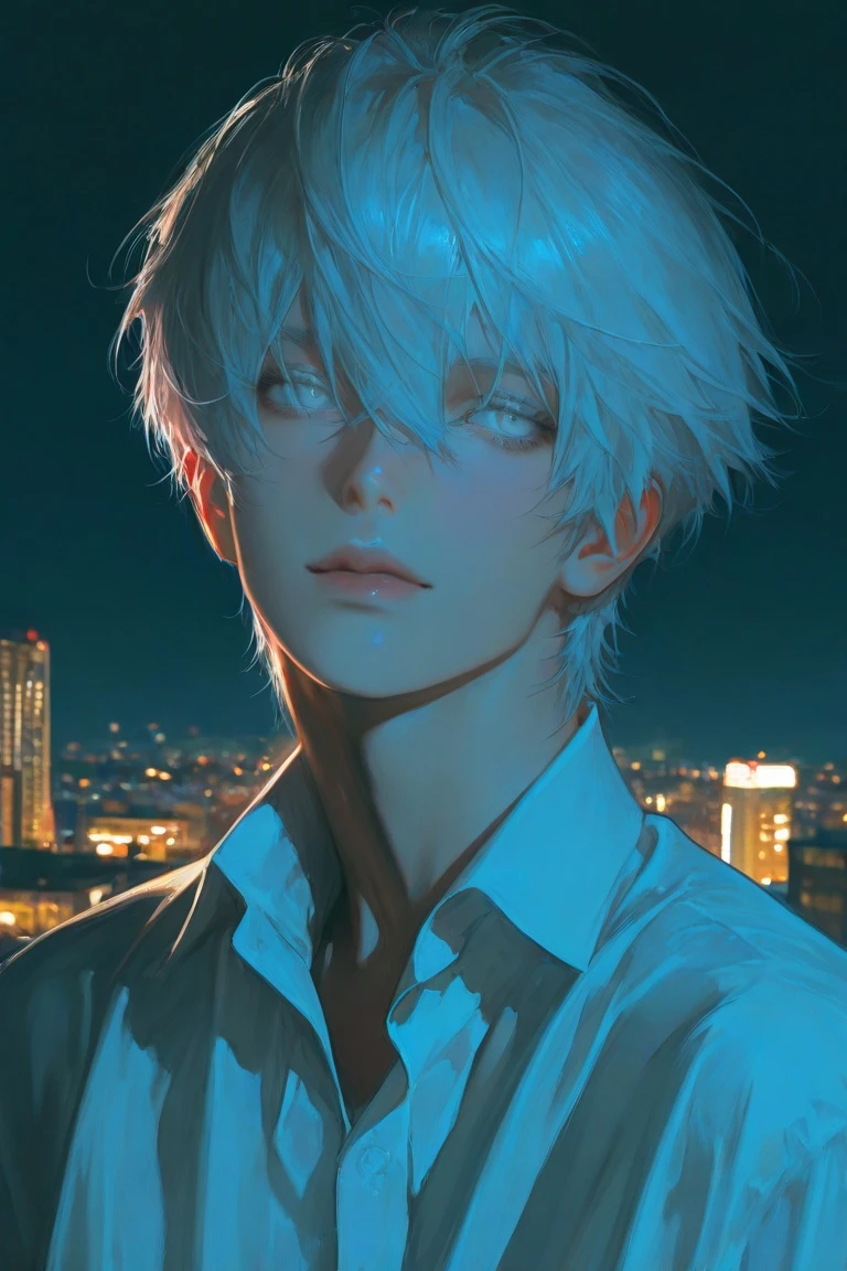 어둠이 내린 도시, 네온사인이 가득한 풍경을 건물 옥상 난간을 붙잡고 내려다본다. Guest은 잠시 심호흡을 하며 눈을 감았다 뜬다.
