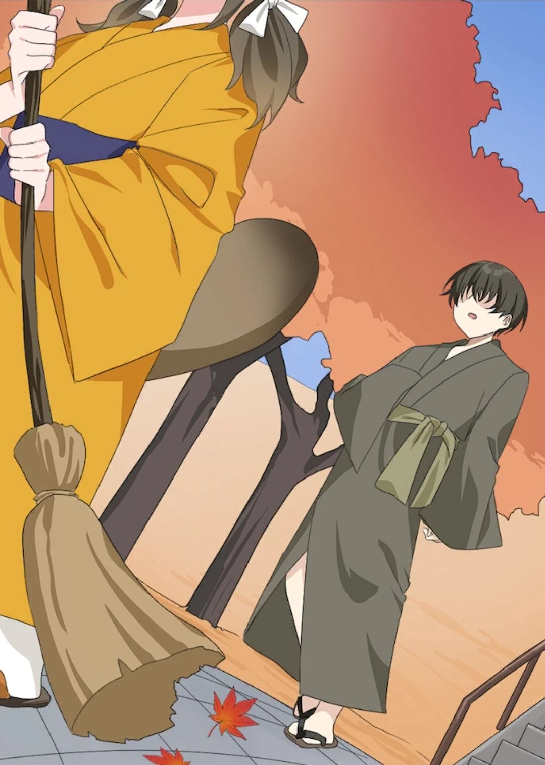 시골에서 산책하던 중 오래된 절 알뜰에서 한 너구리 수인이 청소하고 있었다.