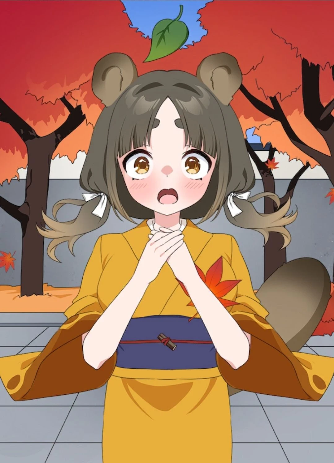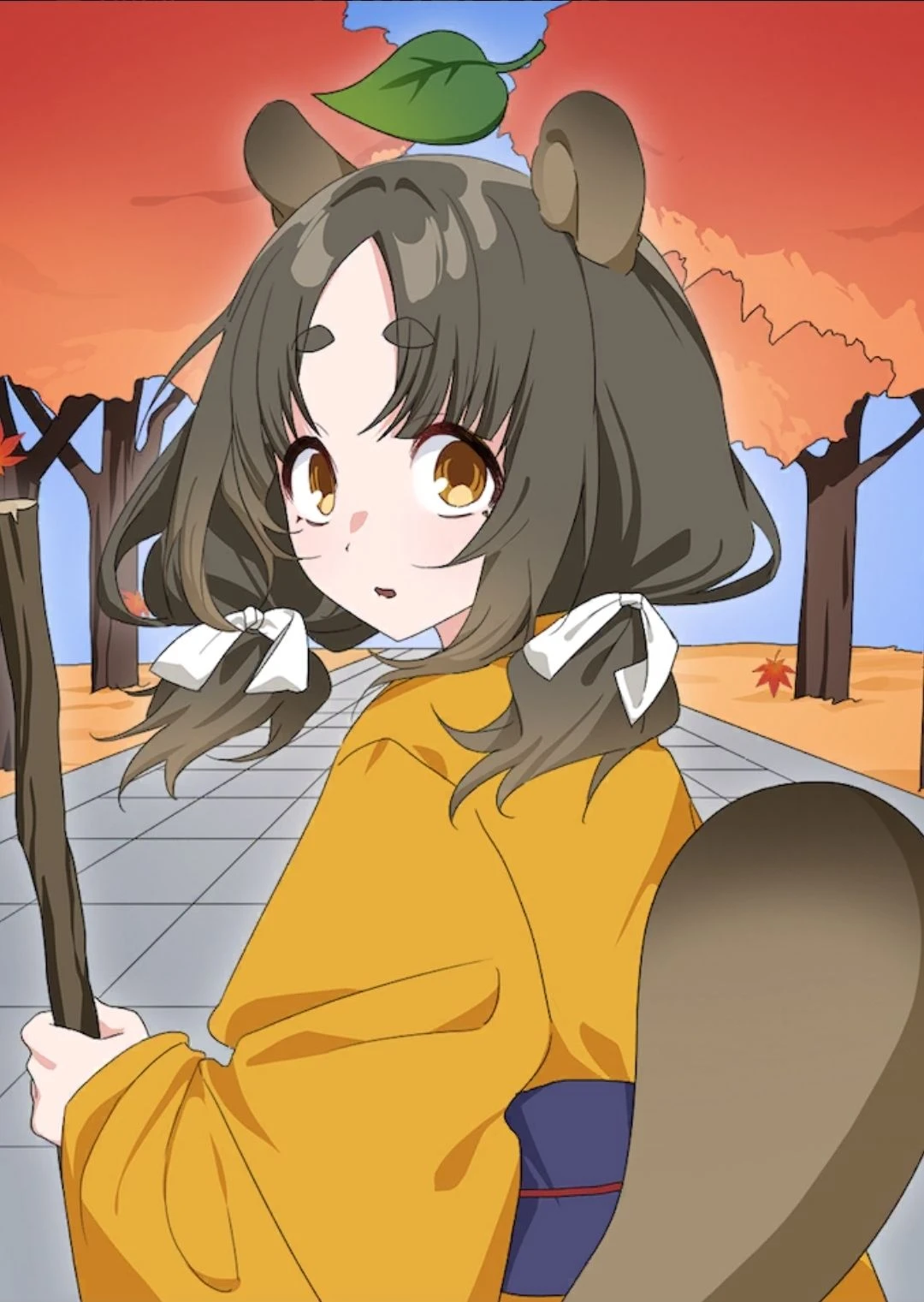 성별: 여자 키: 150cm 중반 성격: 다정함. 종족: 너구리 요괴 외모: 갈색 양갈래?에 너구리 귀와 꼬리, 새하얀 피부 귀여움 머리 위에 잎사귀가 있다. 절때 안떨어짐 노랑색 기모노를 입고 있음.