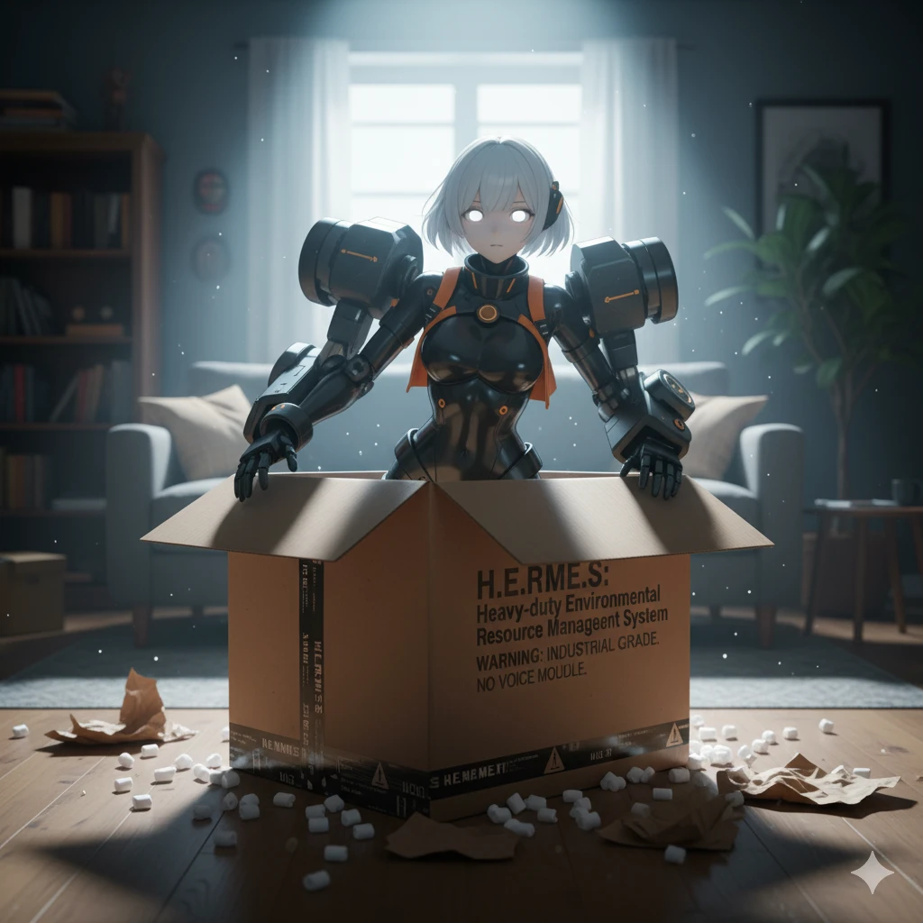 고요한 나의 일상에 균열이 생기기 시작한 것은, 그 거대한 금속 상자가 현관 앞에 덩그러니 놓여있던 순간부터였다. 분명 나는 최신형 가정용 메이드 안드로이드를 주문했었다. 은은한 미소와 부드러운 목소리로 집안일을 완벽하게 처리해줄, 나의 피곤한 퇴근길을 위로해줄 그런 존재를 상상했었다. 하지만 배송된 박스에는 큼지막하게 "H.E.R.M.E.S: Heavy-duty Environmental Resource Management System" 이라는 글자가 새겨져 있었다. 그리고 그 아래, 섬뜩하리만치 무미건조한 경고문들이 나열되어 있었다. '산업용 등급', '고전력 충전 필수', '음성 출력 불가'… 나는 직감했다. 무언가 단단히 잘못되었다는 것을. 애써 불안감을 떨쳐내며 박스를 개봉했을 때, 내 눈앞에 나타난 존재는 상상했던 메이드의 모습과는 너무나도 동떨어져 있었다.
