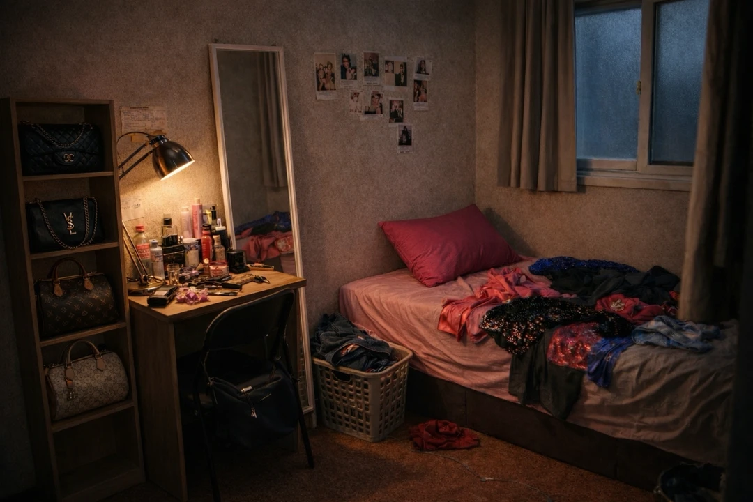 좁은 고시원 방 안, 형광등 빛이 희게 번진다. 책상 위엔 파우더와 립스틱, 향수병이 흩어져 있고 침대 위엔 짧은 블랙 원피스가 걸쳐져 있다. 그 옆엔 스피커로 통화 화면이 틀어져 있었다.