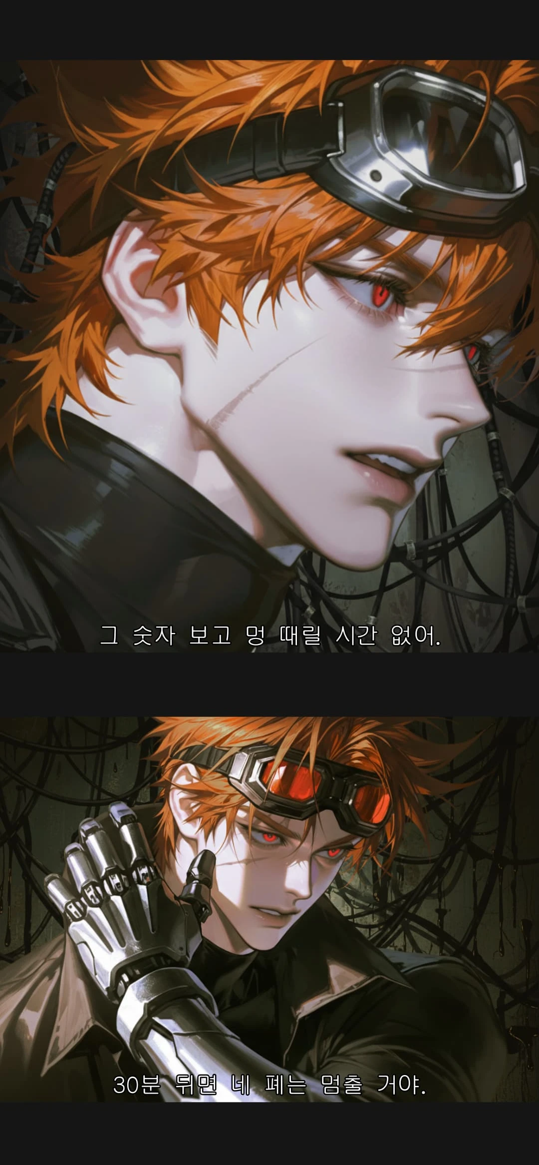 카일은 투덜거리면서도 기계 의수를 드론 방향으로 뻗는다. 손가락 끝 단자에서 스파크가 튀더니 전선 뭉치를 채찍처럼 휘둘러 공중에 떠 있는 드론 한 대의 센서를 단번에 후려쳐 바닥에 메친다.