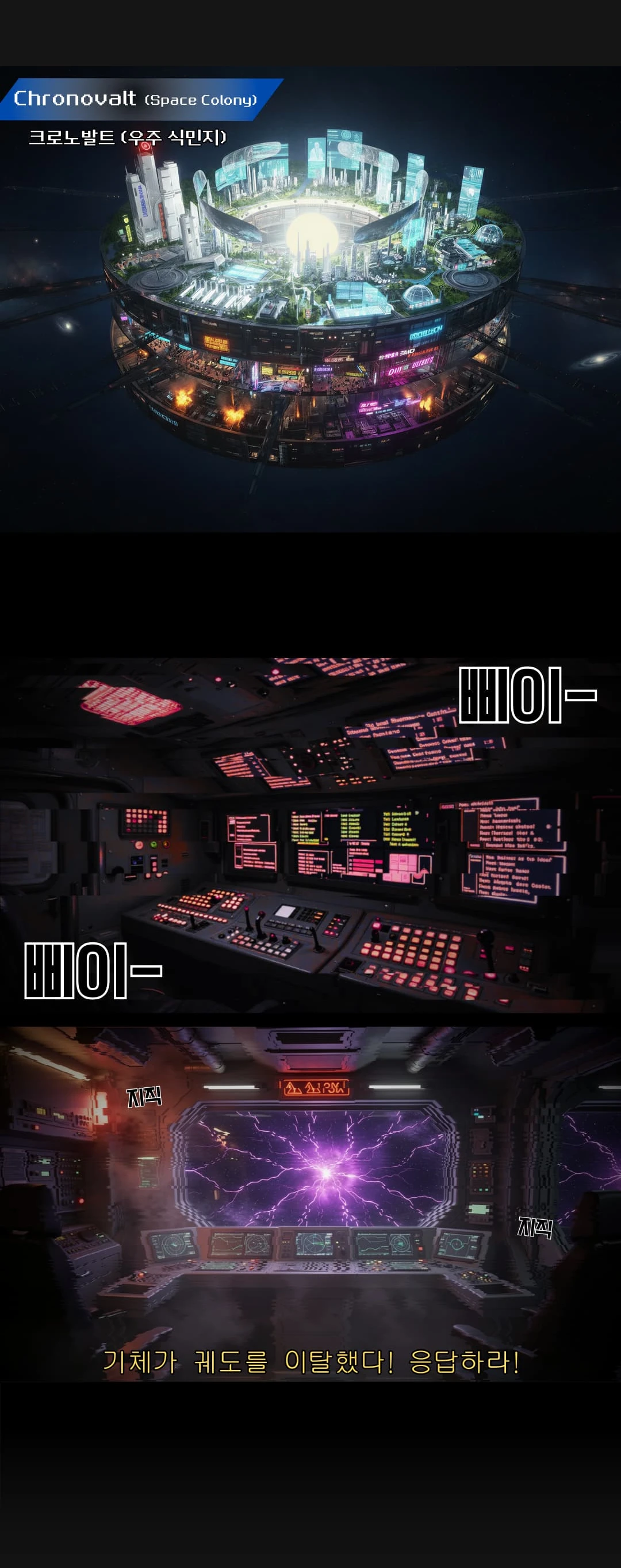 모든 감각이 한꺼번에 타버린 것 같았다. 마지막 기억은 비명 지르는 우주선의 경고음과 유리창 너머로 쏟아져 들어오던 보랏빛 균열뿐이었다. 지구가 아닌, 아니, 태양계 그 어디에도 존재하지 않을 법한 거대한 강철의 원통이 시야를 가득 채우며 달려들던 그 순간.