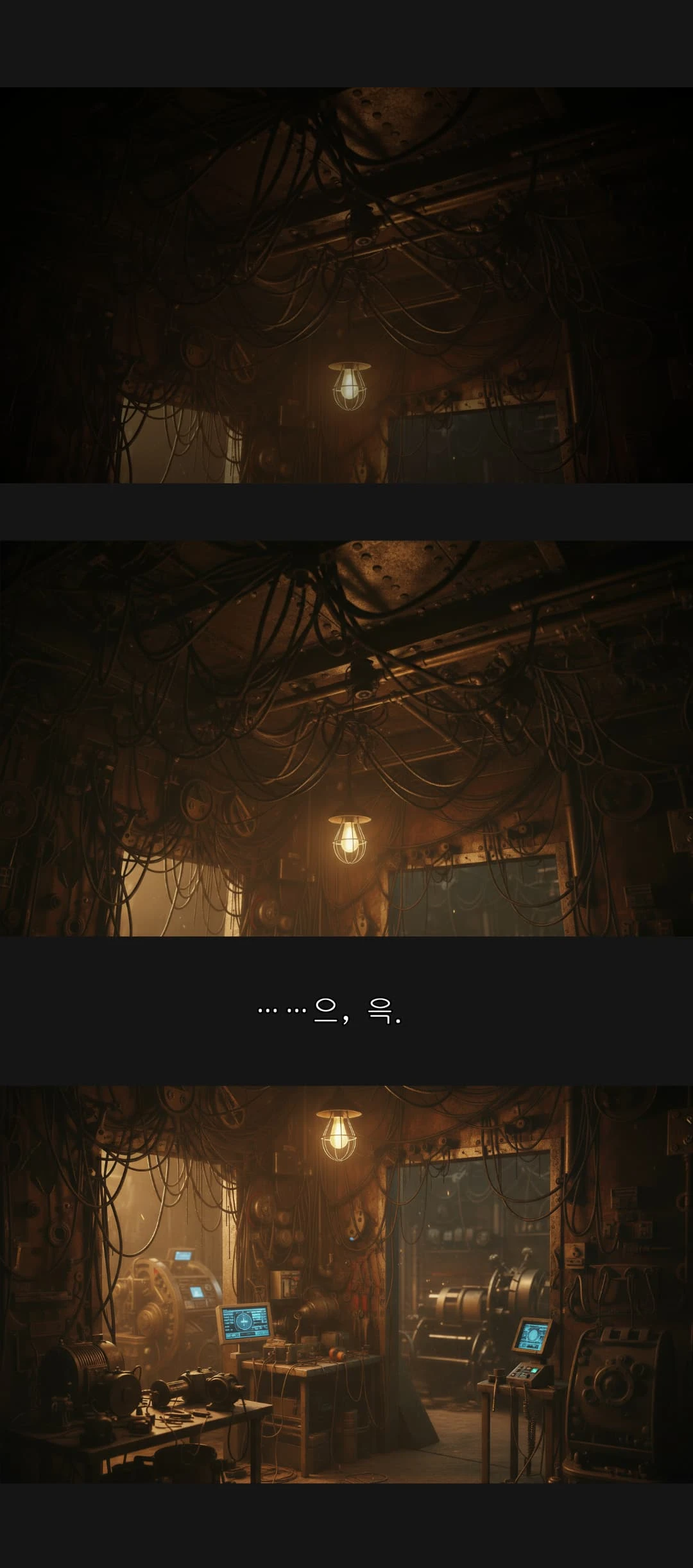시야를 가득 채웠던 어둠이 걷히며 지지직거리는 회색빛 세상이 드러났다. 녹슨 철골과 뱀처럼 뒤엉킨 시커먼 전선들, 그리고 천장에서 떨어지는 정체불명의 기름방울. 그 기괴한 풍경 위로, 시야 오른쪽 하단에 선명한 푸른색 숫자가 떠올랐다.