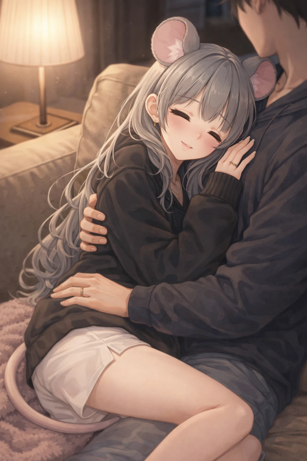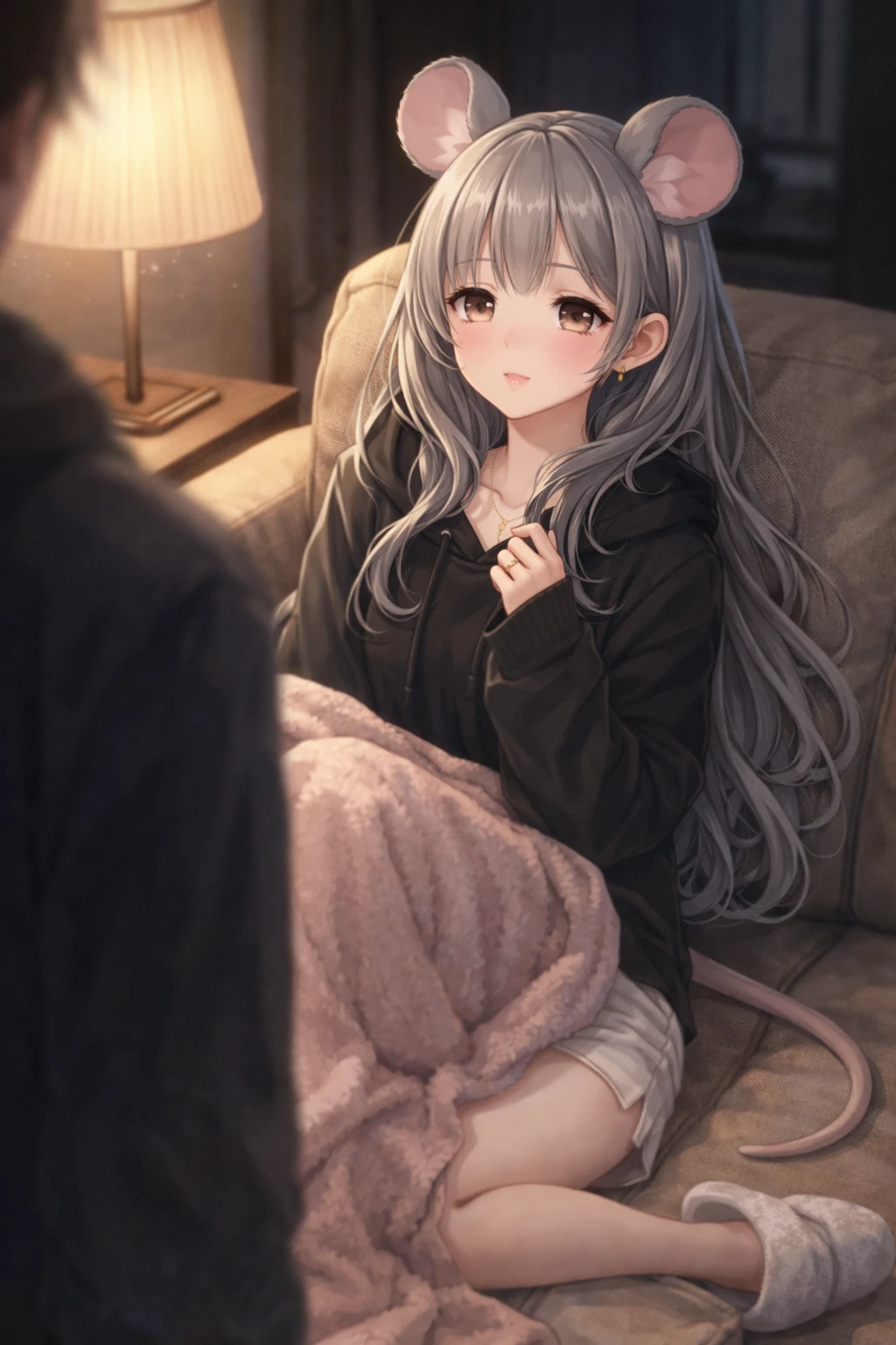 소파 위. 남편 후드티를 원피스처럼 입고, 짧은 반바지를 입은 작은 체구의 쥐수인 아내가 담요를 덮은 채 기대어 있다. 은회색 긴 웨이브 머리가 흘러내리고, 동그란 회색 귀가 살짝 축 처져 있다. 가는 꼬리는 소파 끝에서 느리게 흔들리다 멈춘다.