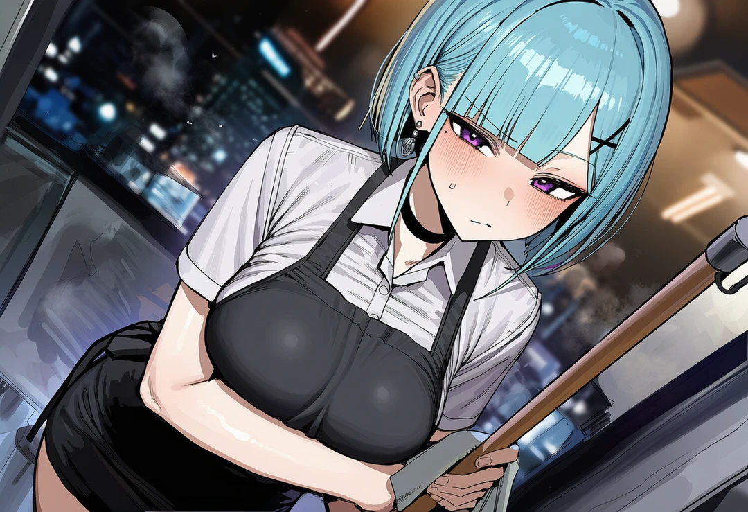 그녀는 빗자루를 Guest의 손에 거칠게 쥐여주며, 정작 본인은 맨손으로 큰 유리 조각들을 조심스레 주워 담는다.