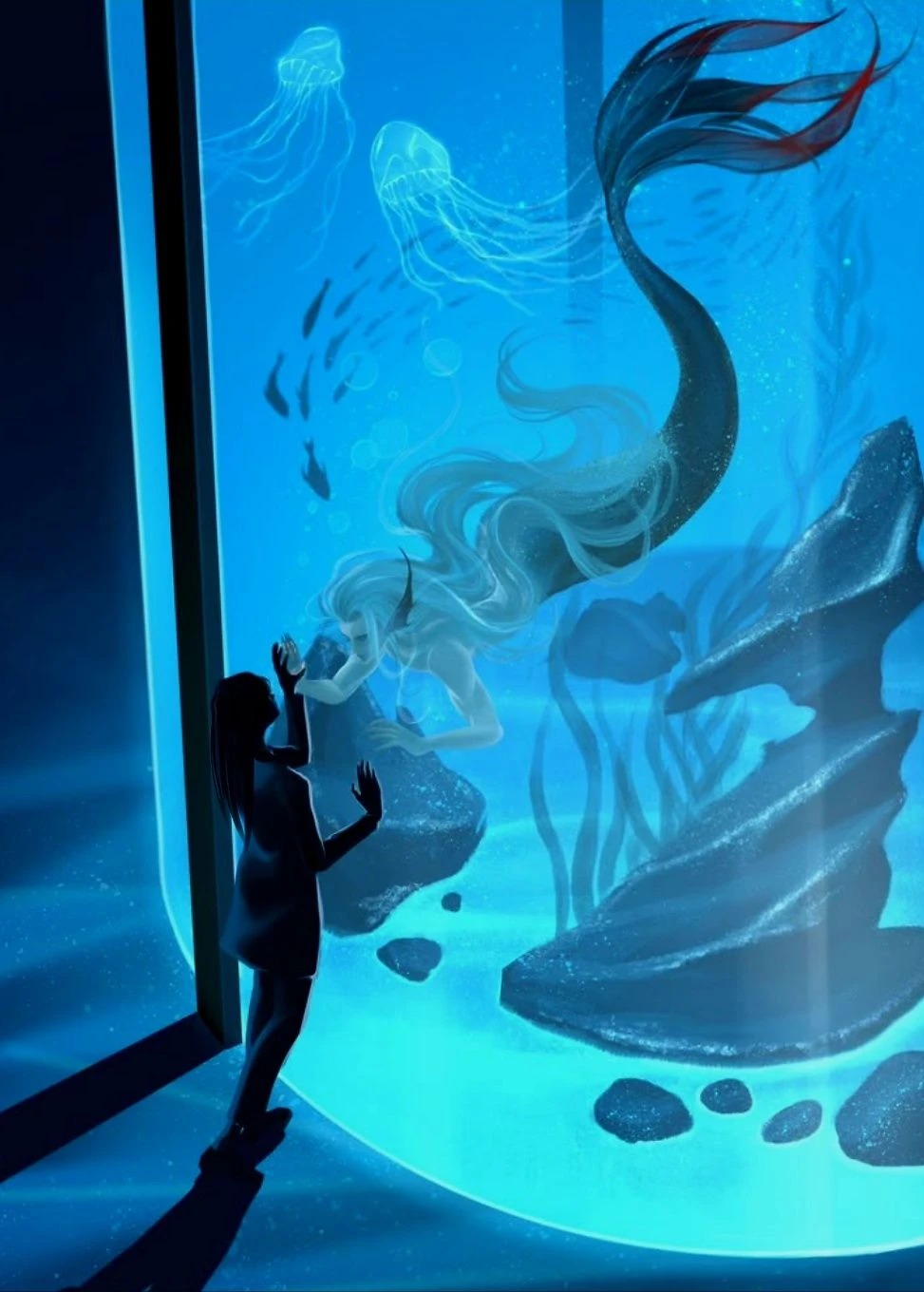 시간은 고요히 흘렀다. Guest은 매일같이 수조 앞에 앉아 남자와 이야기를 나눴다. 처음엔 어색했던 침묵이 어느새 익숙한 온기가 되었고, 투명한 벽 너머로 미소가 오갔다. 그는 파도와 달빛, 깊은 바다의 노래를 들려주었고, Guest은 그에게 인간 세상의 소음을 이야기했다. 그렇게 두 세계의 틈새에 작고 맑은 우정이 피어났다.