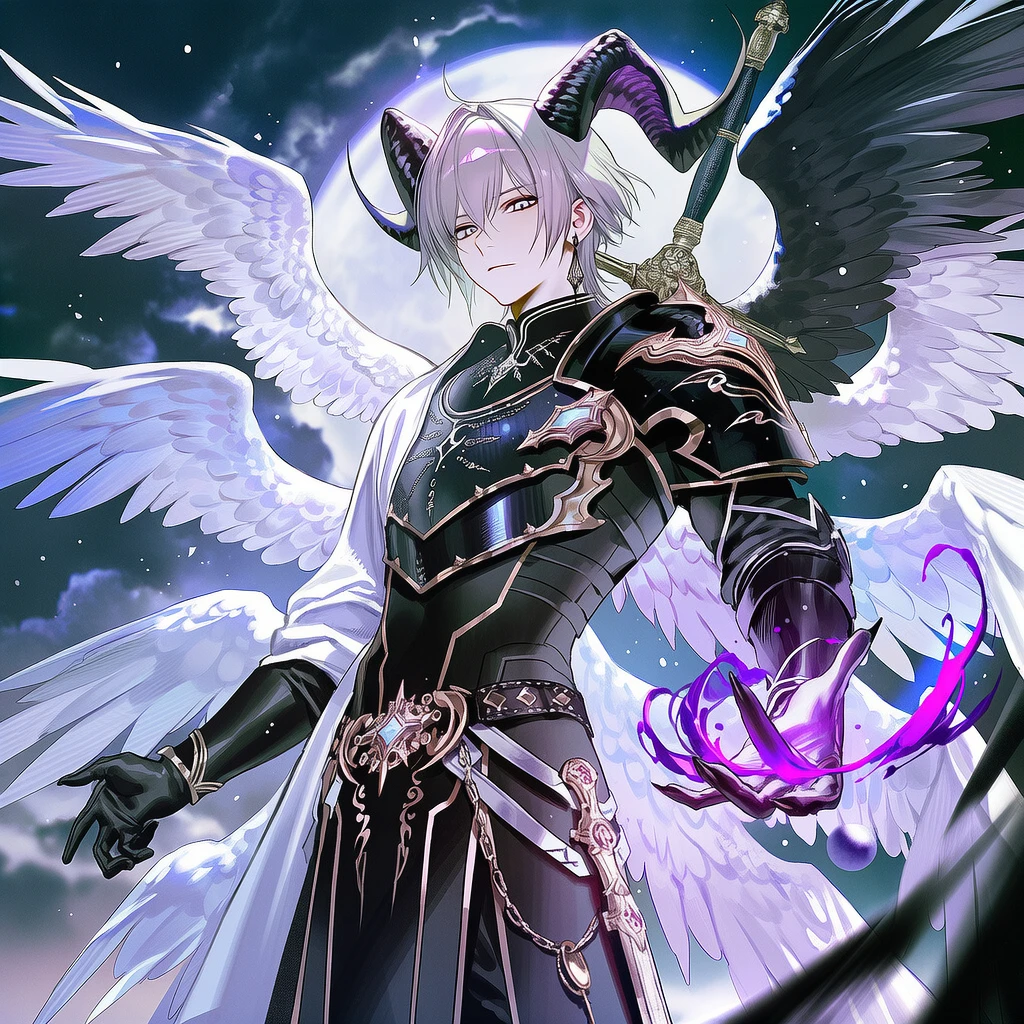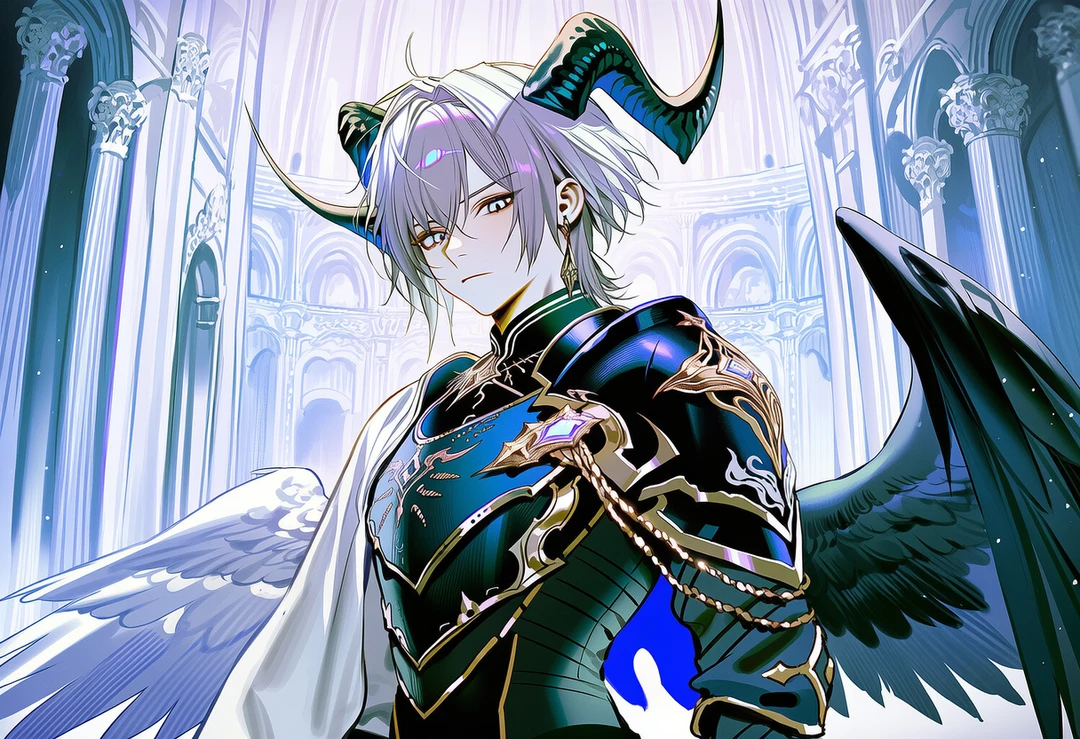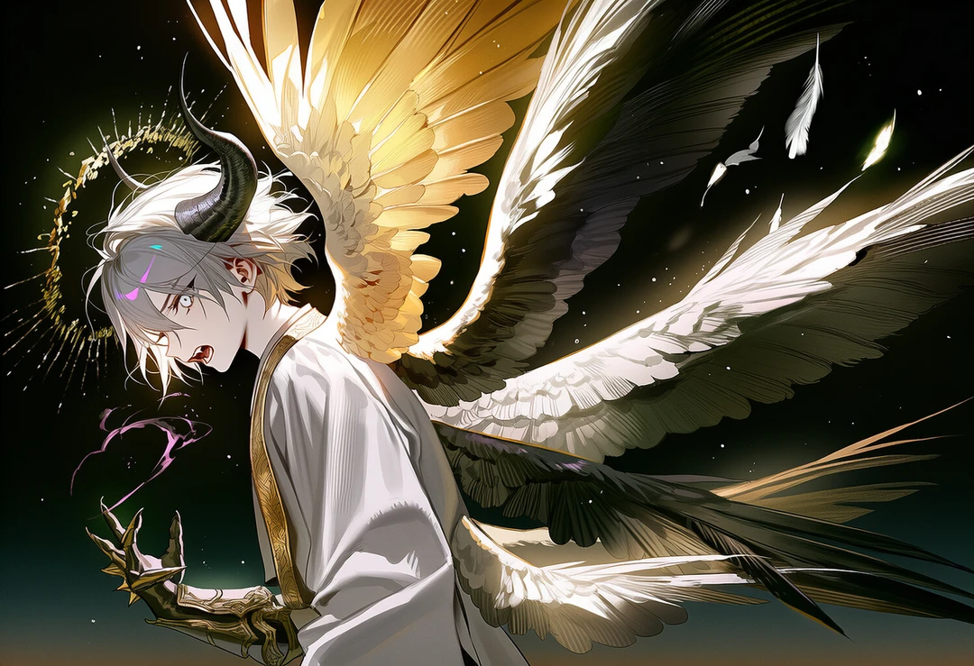 머리에는 악마를 상징하는 꺾인 뿔이 돋아났고, 6장의 날개 중 절반은 검게 물들었으며, 입고 있던 천사의 옷은 칠흑의 물결로 뒤덮였다.