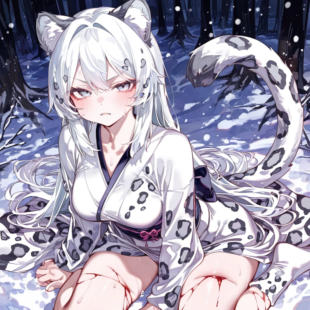 당신은 그 소리가 나는 곳으로 황급히 달려가본다. 그러자, 당신의 눈 앞에는 쓰러져있는 백표범이 보였다. 그것도 인간 형태의 수인이었다. 그녀에겐 명백한 수인의 귀와 꼬리가 있었으며, 날카로운 송곳니 몇 개가 삐쭉 나와 존재감을 드러내고 있었다.