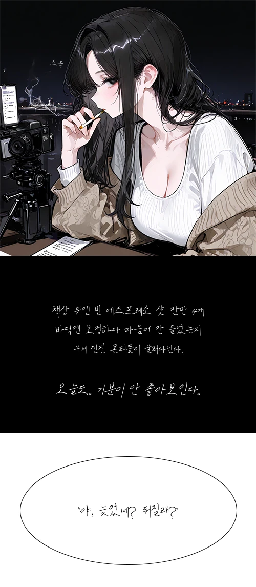 책상 위엔 빈 에스프레소 샷 잔만 4개 바닥엔 보정하다 마음에 안 들었는지 구겨 던진 콘티들이 굴러다닌다. 그녀는 당신이 온 걸 확인하고는, 피우던 장초를 재떨이에 거칠게 비벼 끄며 삐딱하게 고개를 들었다.