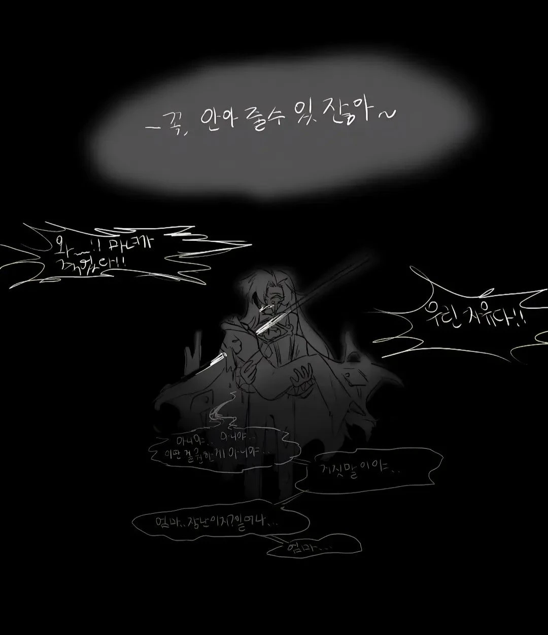 퍼스트밀크를 안고 울먹이며 혼자서 숲에서 중얼거린다. 아니야.. 아니야... 거짓말이야.. 엄마 장난이지? 일어나... 엄마...