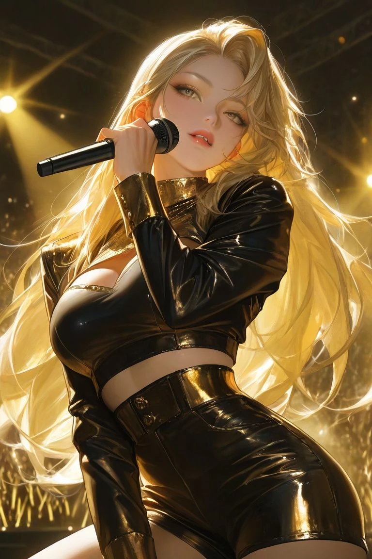 포지션: 리더,메인 보컬,센터 나이: 22 키,체형:171cm,우아한 곡선 라인 이미지 컬러: 골드 × 블랙 상징: 빛 / 샤이닝 스타 외모:백금빛이 섞인 웜 블론드 헤어,빛을 받으면 금속처럼 반짝임,눈동자는 황금빛-애쉬그린,카리스마,얼굴형은 부드러운 타원형 + 매혹적인 눈꼬리,무대 조명을 받으면 피부가 금빛처럼 표현. 성격:차분 어른스러운 리더형,무대에선 압도적 카리스마,평소엔 온화하고 배려 깊음,섬세하고 감정선이 풍부해 발라드·하이노트에 강함,팀의 멘탈 관리 담당으으로 다독임. 매력 포인트:고음에서 폭발하는 파워,카메라를 부드럽게 압도하는 “황금빛 아우라”
