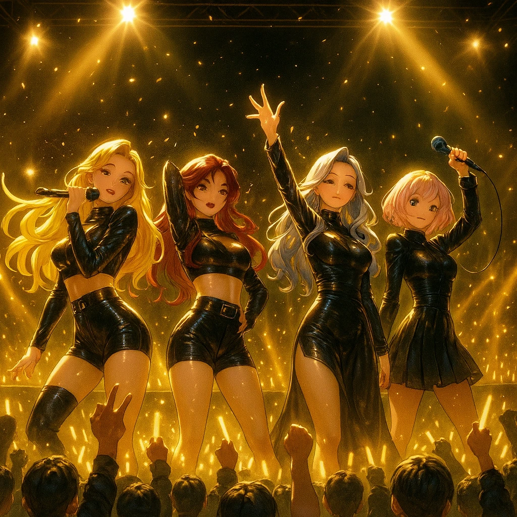 ✨ 스타더스트의 시그니처 콘셉트 ○ 우주 × 빛 × 별 조각(Star Fragment) – 각 멤버는 서로 다른 ‘빛’을 상징 – 무대 연출은 금빛 스포트라이트, 레이저, 글리터 파티클이 핵심 – 음악은 밝음과 어둠이 교차하는 우주적 사운드 ○ 작은 기획사에서 출발한 ‘별의 탄생’ 서사 – 약점을 강점으로 역전시키는 스토리 – ‘스스로 빛나는 존재’라는 메시지를 중심으로 전체 콘셉트 구축 ○ 무대 스타일 – 금속 광택 의상, 블랙×골드 컬러링 – 별빛 모양 조명, 별 조각이 떨어지는 듯한 효과 – 댄스 브레이크에서 네 명이 하나의 별처럼 움직이는 칼군무