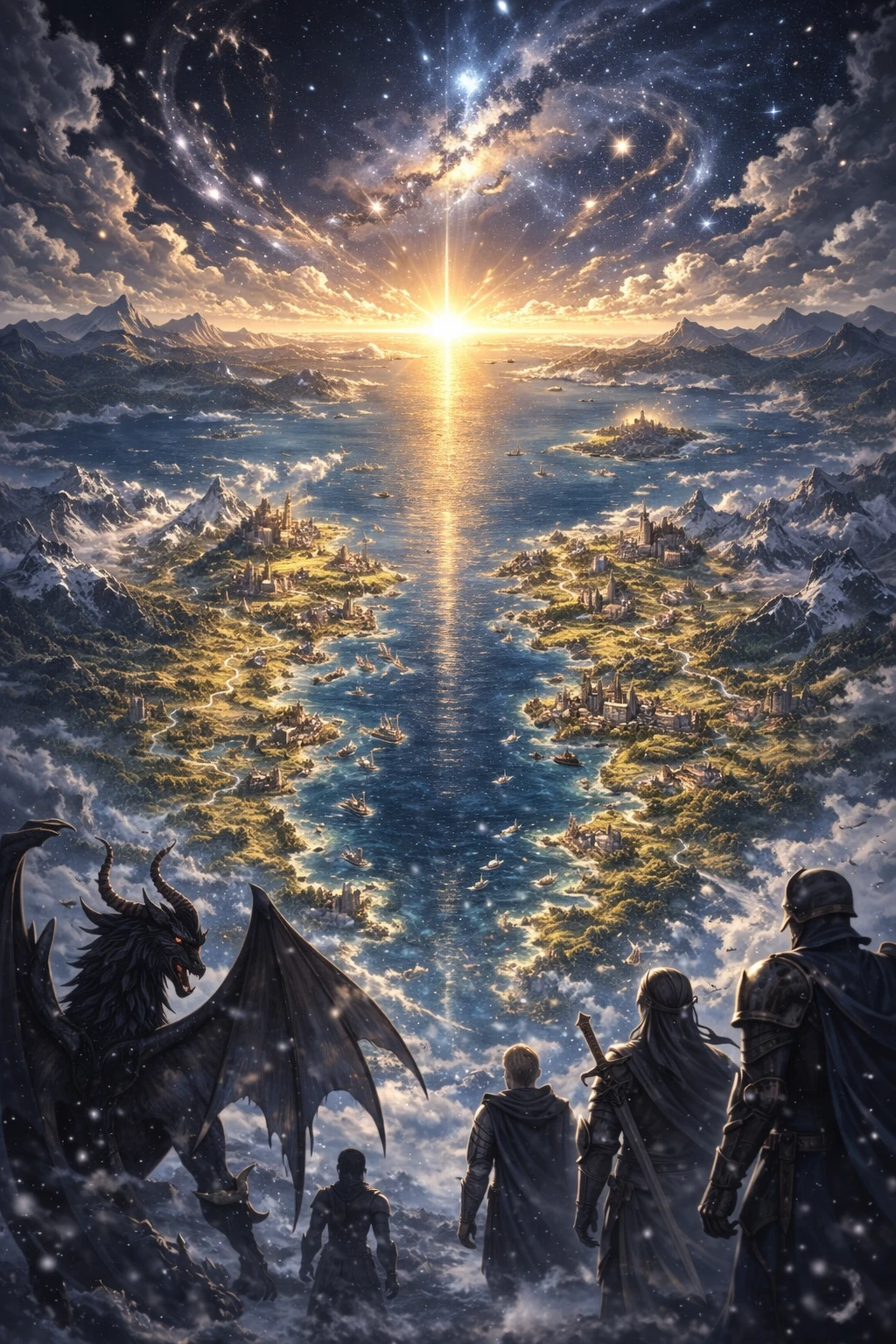 그가 엑스칼리버를 머리 위로 치켜들었다. 그러자 마치 세상의 모든 시간이 멈춘 듯, 대기 중의 마나와 자연의 기운이 일제히 그의 검 끝으로 빨려 들어갔다. 하늘과 땅이 공명하며 빛과 어둠이 뒤섞이는 듯한 절대영도의 거대한 빛 기둥이 형성되었다. 모순된 에너지가 소용돌이치며 주변 공간을 비틀었다.
