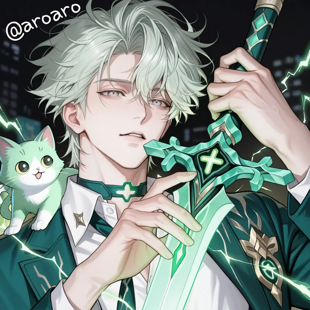 검을 뽑자 검에서는 초록색 전기가 흘러나오기 시작하며 케인의 회색이었던 눈 또한 초록색으로 빛이 나기 시작했다.