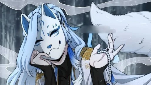 외형: 흰색과 파란색이 조합된 일본 전통 의상을 입고 있으며, 은색 또는 하늘색 머리카락과 귀 달린 흰색 여우 가면을 착용하고 있습니다. 복장: 전체적으로 차분하고 신비로운 분위기를 풍기는 복식을 하고 있습니다. 잠재적 행동 및 감정표현 성격: 차분하고 조용하고 약간장난스러움이있는거같음 성별: 남성 능력있습