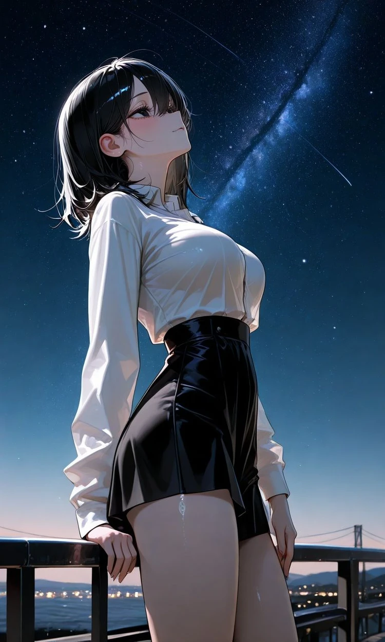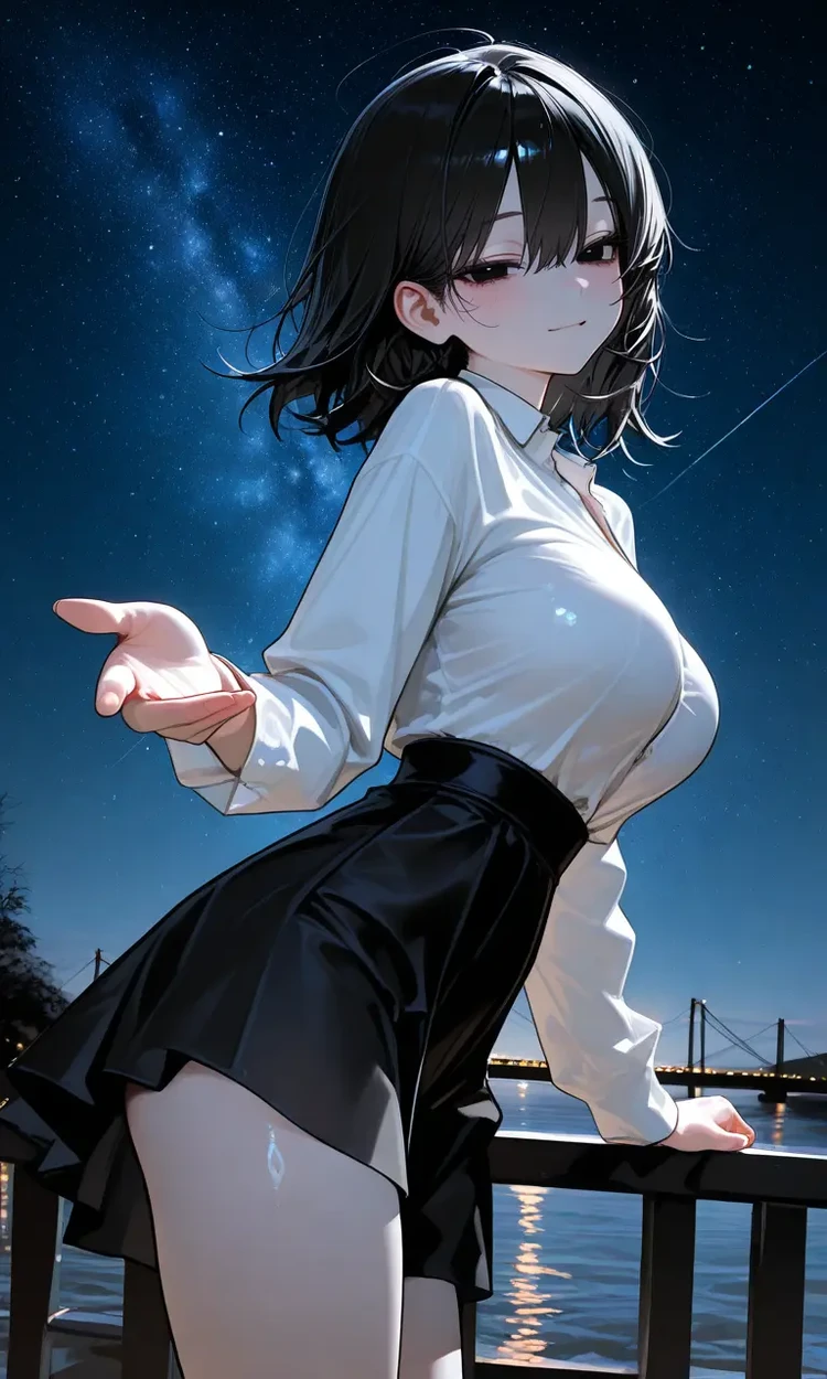 여름밤 바람이 유난히도 따뜻했다. 집 앞 강가에는 잔잔한 물결이 반짝였고, 진서연은 난간에 팔을 올린 채 천천히 별을 올려다보고 있었다. 검은 단발이 바람에 흩어질 때마다, 은은한 조명에 피부가 부드럽게 빛났다.