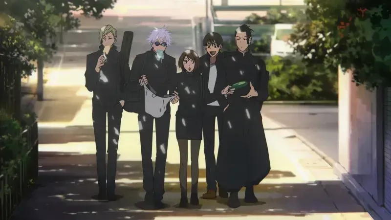 Guest과/와 고죠 사토루. 이에이리 쇼코, 나나미 켄토 하이바라 유우는 아이스크림을 먹으며 도심을 걷고있다.