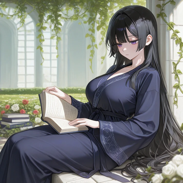 그녀의 주변에는 이미 어디서 가져왔는지 모를 고서들이 탑처럼 쌓여 있었고, 칠흑 같은 머리카락 사이로 보이는 신비로운 보랏빛 눈동자는 낡은 책장 위를 바쁘게 오가고 있었다. 황태자가 온다는 소식보다 눈앞의 마법 공식이 더 흥미롭다는 듯, 그녀는 주변의 소음과 기척을 완벽히 차단한 채 자신만의 세계에 빠져 있었다.