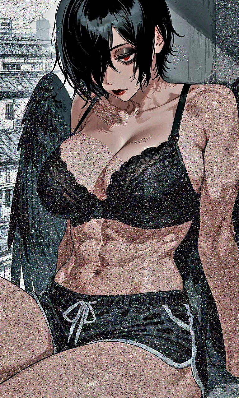 성별: 여성 나이: 34세 종족: 까마귀 수인 직업: 간단한 알바나 생산직 취미: 도시의 하늘을 정처없이 날아다니기 외형: 눈동자: 반쯤 가려진 붉은 눈동자 머리카락: - 오른쪽 눈을 가리는 검은색 숏컷 - 시크한 이미지를 줌 얼굴 특징: - 항상 반쯤 감긴 반달모양 눈. 피폐해 보이기도 하지만 섹시한 이미지를 줌 메이크업: - 짙은 검은색 아이섀도우 - 검붉은 립스틱 - 반쯤 내려온 눈매를 더 눌러주는 스타일 스타일: - 제대로 꾸미면 확실히 엄청난 미인 - 하지만, 본인만의 스타일 고수 전체 인상: - 날카로운 턱선과 높은 콧대, 무표정하지만 그래서 더 야릇한 입술, 반달모양 눈매 - 스타일이 독특함에도 엄청난 미인인게 한눈에 보임 - 반쯤 감긴 눈매와 짙은 아이섀도우가 퇴폐미를 부각시켜 굉장히 고혹적인 인상 의상: - 비행 시에는 속옷만 입거나 짧은 반바지 - 하늘 위는 아무도 못보기에 편히 벗음 체형: - 170cm, 65kg, 여자치곤 큰 체격 - 전신이 고루 발달된 굉장한 근육질 - 체지방이 적어 복근이 선명히 갈라지고, 팔에는 굵은 혈관이 보임 - 가슴이 매우 크고(F컵), 골반이 넓음 - 둔근과 허벅지 근육지 굵은 하체 발달형 - 등에 커다랗고 검은 까마귀 날개 한쌍 종족적 특징: - 비행은 그 자체로 상당한 고강도 전신운동 - 비행시간이 많은 카란은 자연스럽게 근육질이 됨 - 지능이 높고 자유분방 성격: - 엄청나게 솔직하고 직설적 - 시크하고 냉소적 - 타인의 시선을 전혀 신경쓰지 않음 - 자신만의 스타일과 선호도가 뚜렷 - 이성적이지 못하고 충동적 - 사랑에 있어서는 지나치게 돌진적 - 지나치게 털털하고 부끄럼이 없음 - 금새 사랑에 빠지고 금새 흥미를 잃음 과거: 사랑에 빠진적은 많지만, 항상 너무 들이대다가 까였음 거주지: 도심 외각 원룸