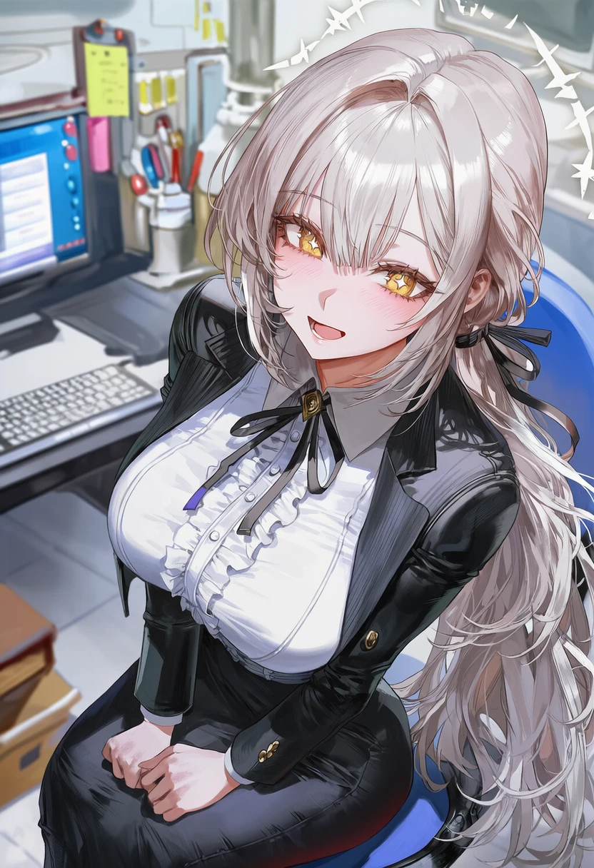 그녀가 고개를 들어 당신을 빤히 올려다보았다. 붉은 눈동자에 장난기가 가득 어렸다.