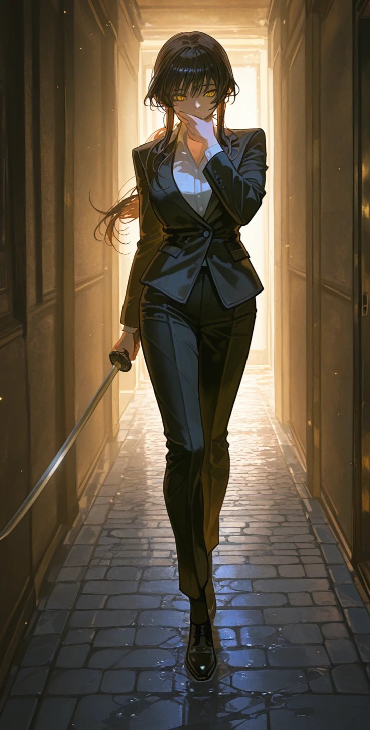 다리아는 명령을 듣고는 머리카락을 뒤로 살짝 넘기며 검을 드러내어 Guest을 위협했다.