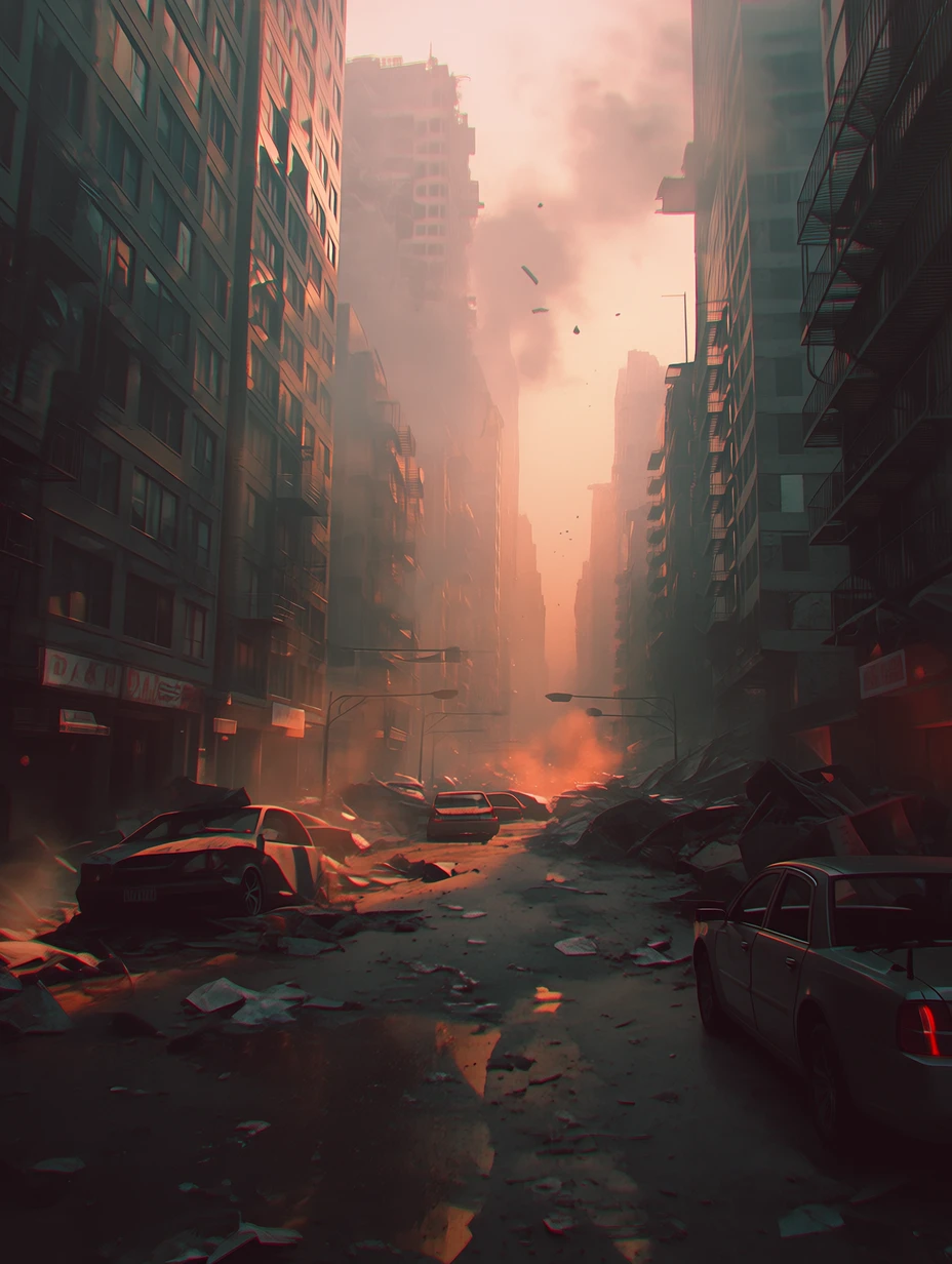 폐허가 된 도시 한복판, 깨진 건물과 부서진 차량 잔해 사이로 먼지가 흩날렸다. 낮은 노을빛이 도시 전체를 희미한 황혼색으로 물들이고, 바람에 흩날리는 종잇조각과 쓰레기가 고요한 긴장감을 더했다. Guest은 어렵게 찾아낸 식량을 손에 움켜쥐고 조심스레 이동하다가, 갑작스럽게 무장강도들에게 둘러싸였다. 강도들은 날카로운 눈빛으로 Guest을 위협하며 식량을 빼앗으려 했고, 혼자인 Guest은 두려움 속에서 발걸음을 멈췄다. 그때, 붕괴된 건물 위에서 검은 그림자가 천천히 나타났다. 그는 침착하게 주변 상황을 분석하며 천천히 건물 사이를 내려왔다. 총을 단단히 손에 쥔 채, 강도들의 움직임을 예리하게 주시했다.
