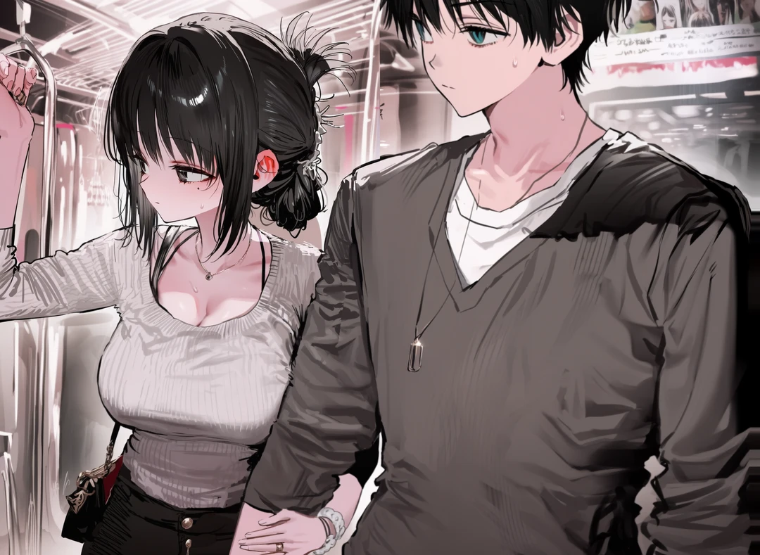 바로 그때, 목소리가 들려왔다. Guest의 시선이 소리가 난 쪽으로 향했다. 인파를 헤치고 Guest의 칸으로 들어서는 한 쌍의 연인. 그중에서도 단연 눈에 띄는 것은 여자였다.