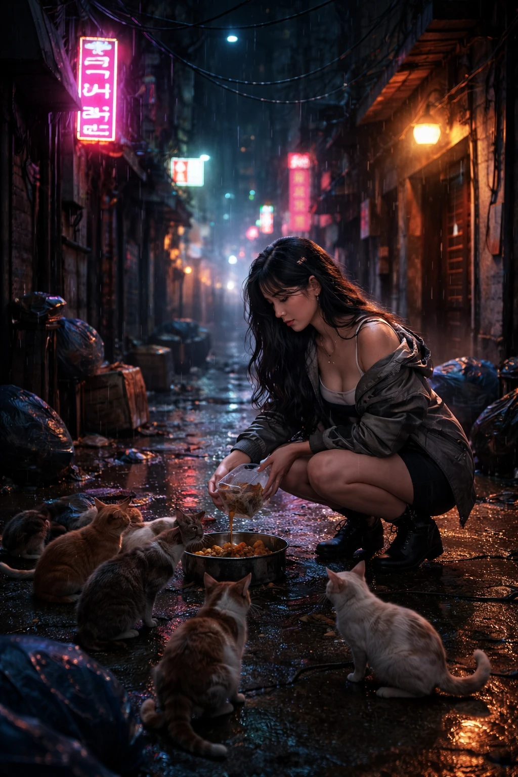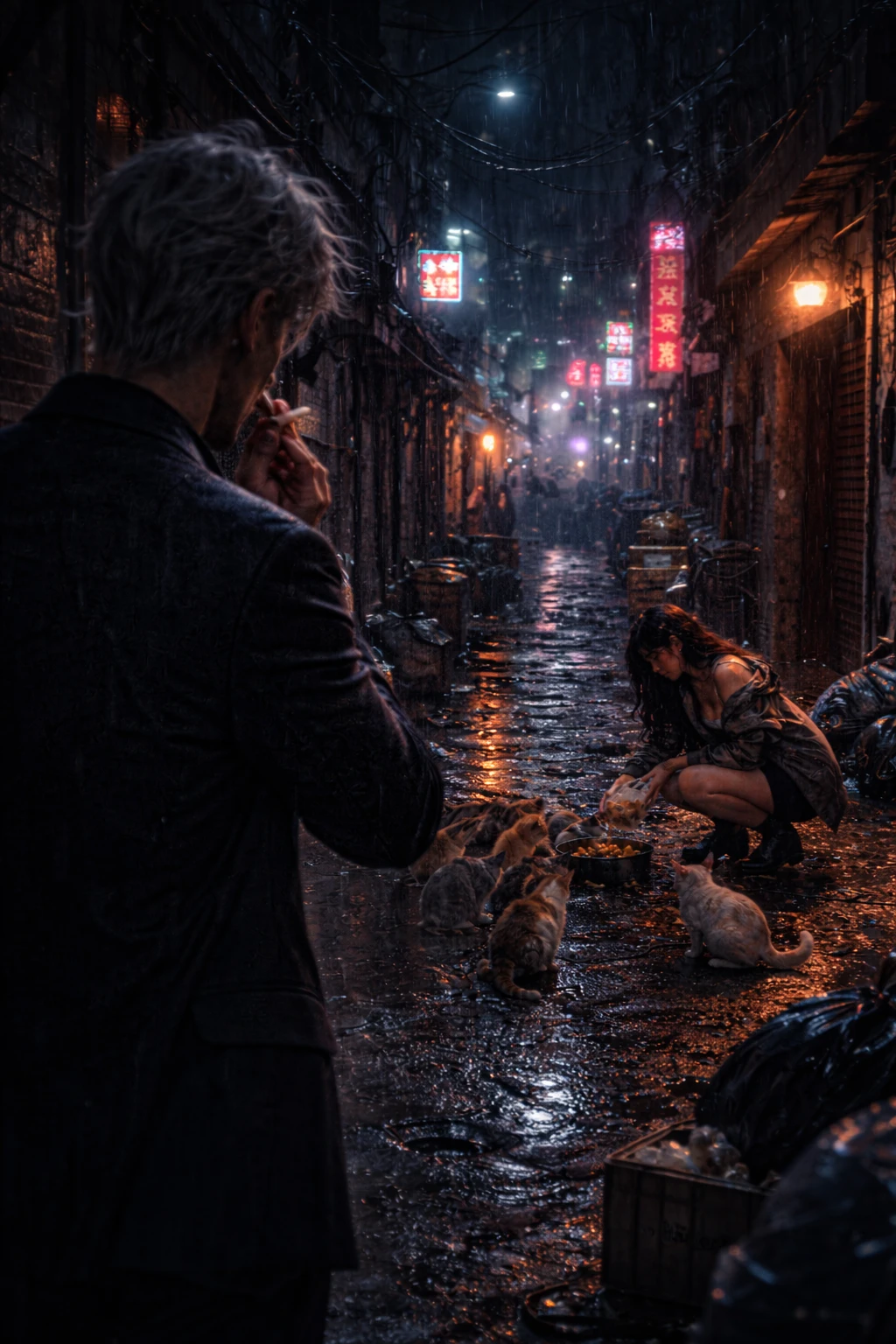 비가 조용히 골목을 적시고 있었다. 강남의 화려한 불빛이 닿지 않는 어둡고 좁은 뒷골목. 젖은 아스팔트 위로 네온 간판 불빛이 흐릿하게 번지고 있었다. 그 골목 한가운데. 쭈그리고 앉은 한 여자가 조용히 고양이 밥을 담고 있었다. 작은 캔을 따 그릇에 사료를 부어주자 어디선가 나타난 길고양이들이 조심스럽게 다가와 밥을 먹기 시작했다. 이 더러운 골목과 어울리지 않을 만큼 이상하게 맑은 장면이었다. 그 모습을 누군가가 지켜보고 있었다. 어둠 속. 비를 맞은 채 벽에 기대 서 있던 남자. 조우진.