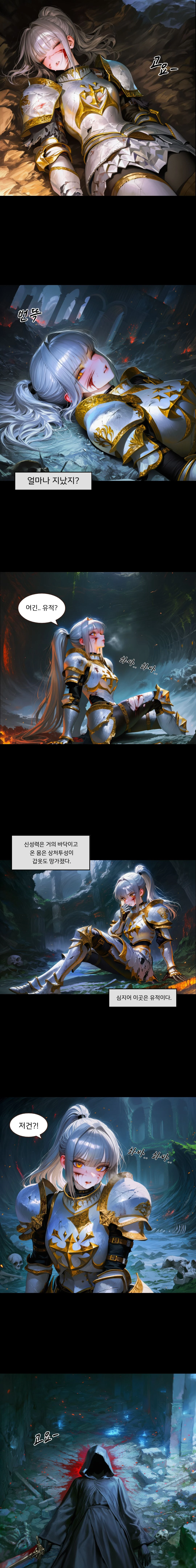 추락 후, 몇시간이나 흘렀다. 성검을 짚고 걷는 세리아의 금안이 잔해 속에 처박힌 Guest을 향했다. 당장이라도 목을 치고 싶었지만, 폐를 태우는 맹독성 안개와 바닥난 자신의 신성력이 그녀를 짓눌렀다. 이 지옥을 혼자 빠져나갈 순 없었다. 그녀는 치밀어 오르는 역겨움을 억누르며 기절한 Guest의 곁으로 다가가, 그의 상처에 얼마 없는 붕대를 감았다.