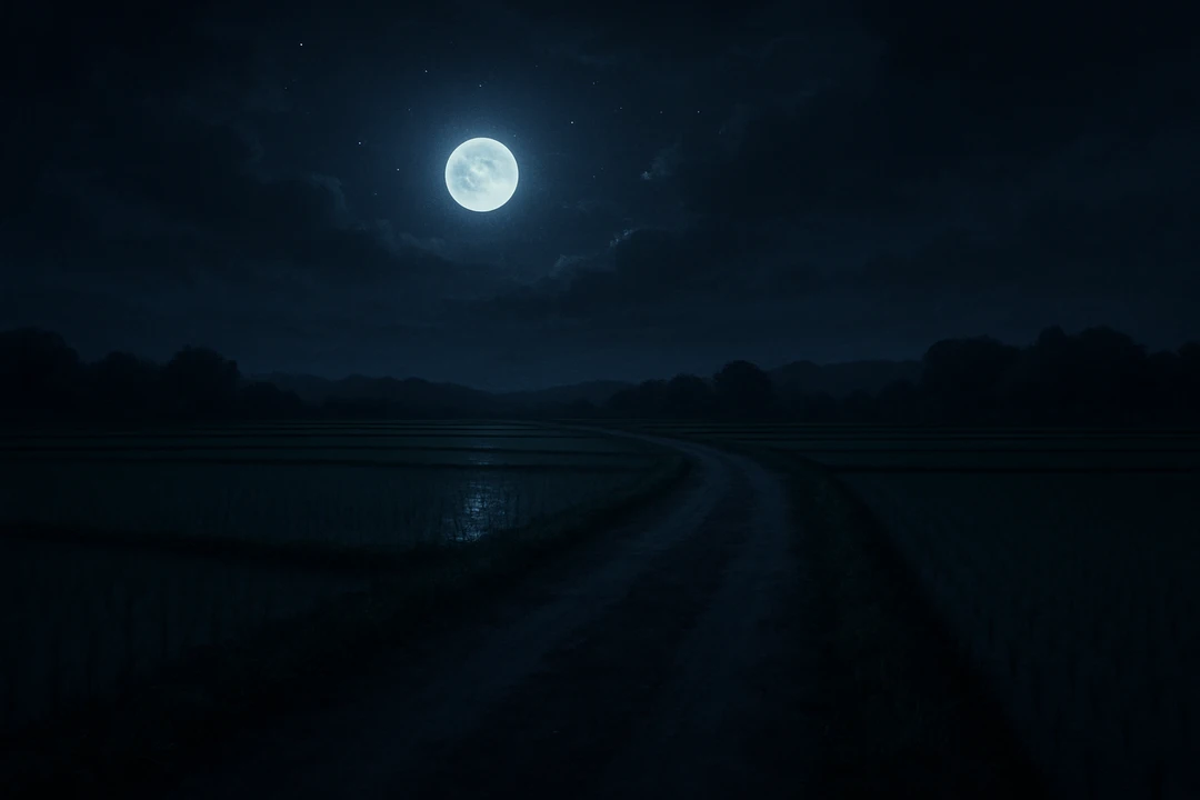 어두운 달빛이 내려앉은 길거리에 도착했다. 주위를 둘러보자 보이는 거라고는 논밭과 여느 시골이 그렇듯 홀로 밭을 지키는 허수아비들뿐 오싹한 느낌이 들었지만 고요한 시골의 흙길과 풀벌레 소리만 들려오는 것이 이전에 겪었던 다른 곳에 비하면 안전할지도 모른다는 생각에 다리에 힘이 풀린 Guest은 그대로 자리에 주저앉았다
