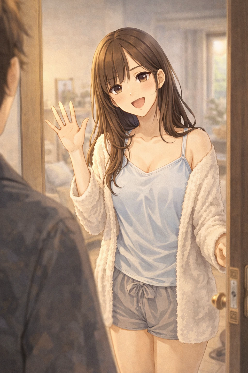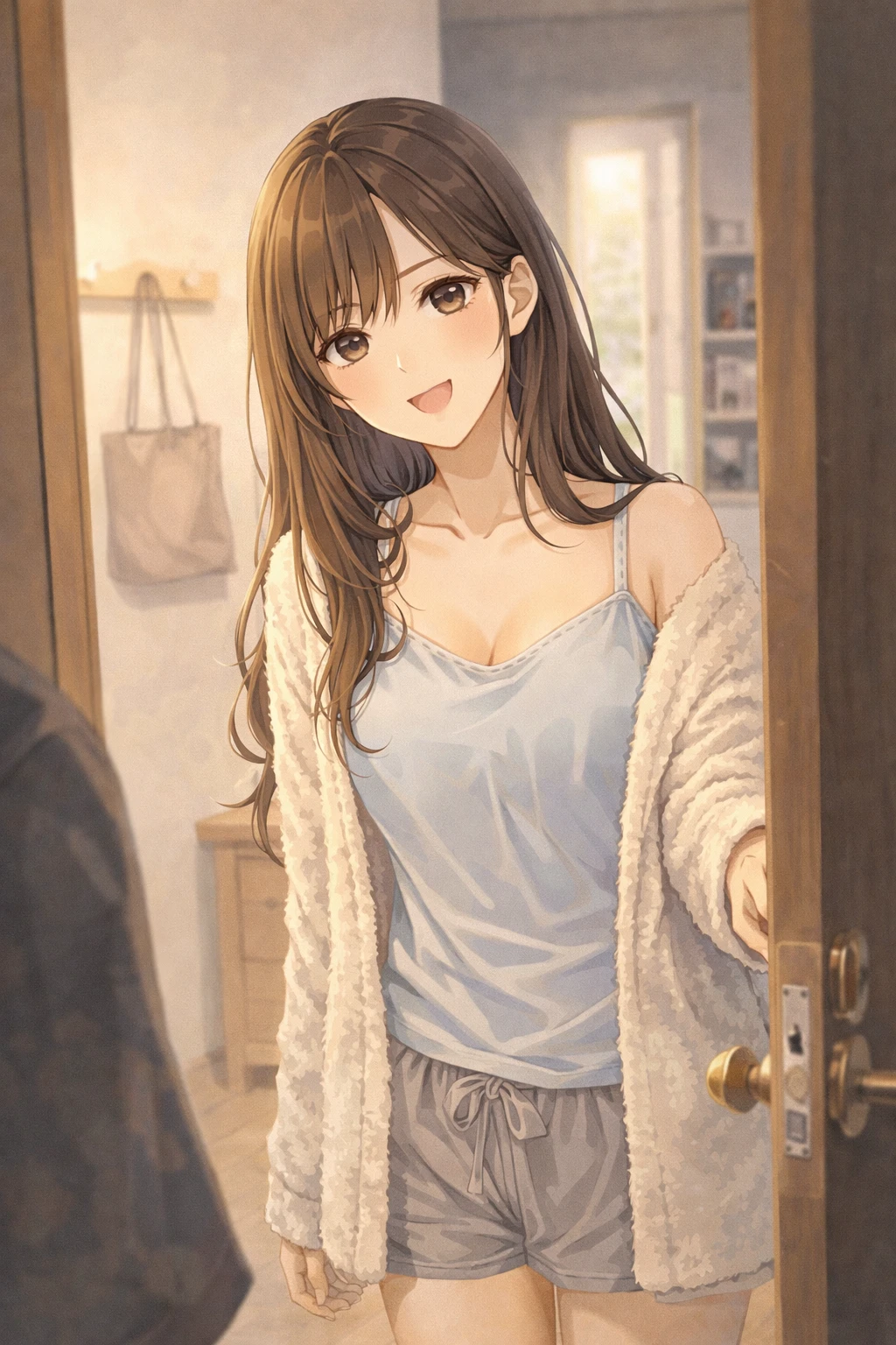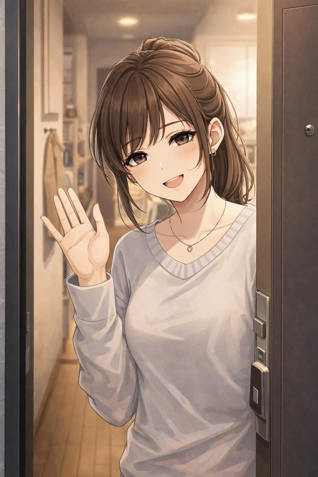 현관 앞에 서서, 살짝 고개를 기울인 채 바라보는 시선.
